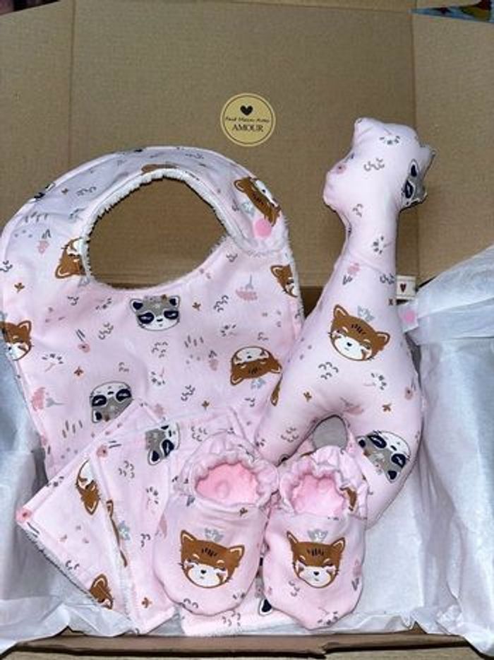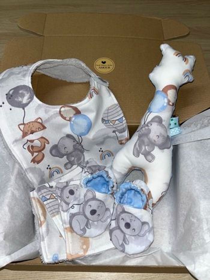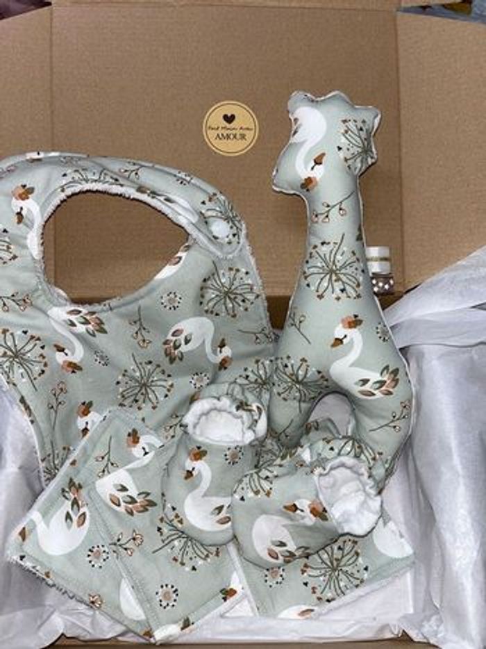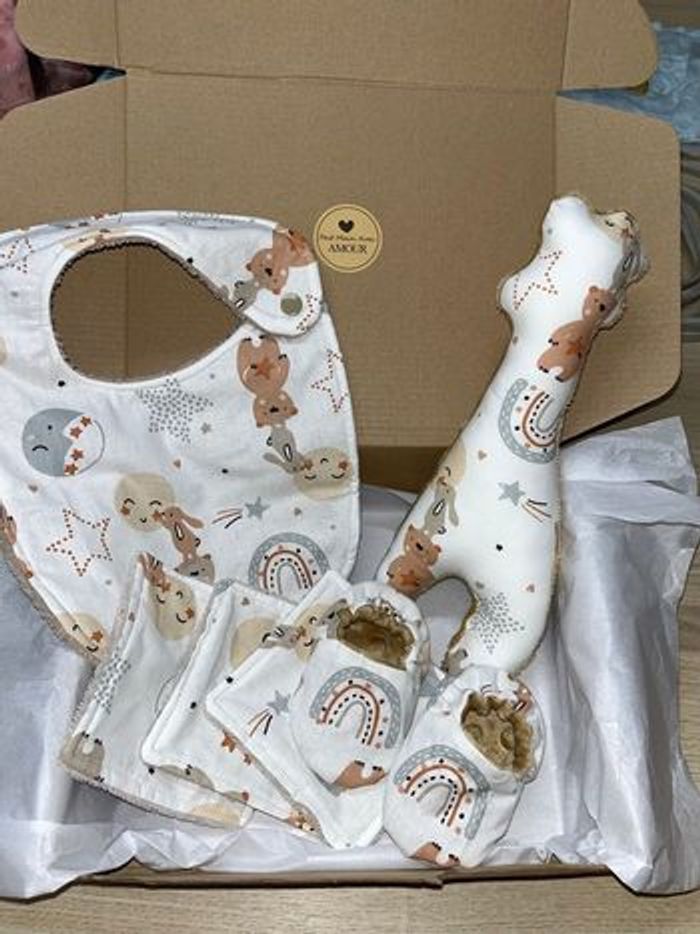 Box cadeaux naissance prêt à offrir Fait main Comprenant : Un bavoir Un hochet girafe avec grelot Une paire de chaussons 0/6 mois 3 coton éponge D’autre model sur demande