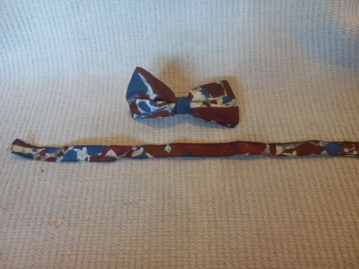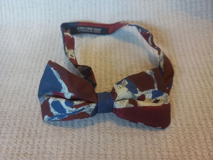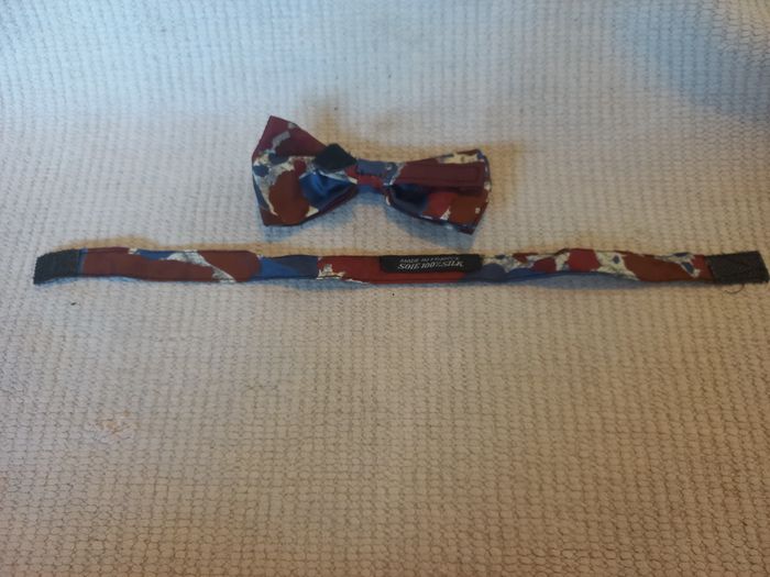 Très joli nœud papillon fabriqué en France, en 100 % soie (SILK), aux motifs élégants bordeaux et bleu sur fond blanc/gris. Un accessoire chic et original, parfait pour les grandes occasions comme pour un style soigné au quotidien. ✨ Détails : Type : nœud papillon Fabrication : Made in France Matière : 100 % soie (SILK) Couleurs : bordeaux, bleu, fond blanc/gris Système : légèrement ajustable grâce à des scratchs Style : chic / élégant / rétro 📌 État : très bon état 👉 Soie propre, belle tenue (voir photos) 🎩 Idéal pour un mariage, une cérémonie, une soirée élégante ou pour apporter une touche d’originalité à une tenue. 📩 N’hésitez pas à me contacter pour toute question ou photo supplémentaire.