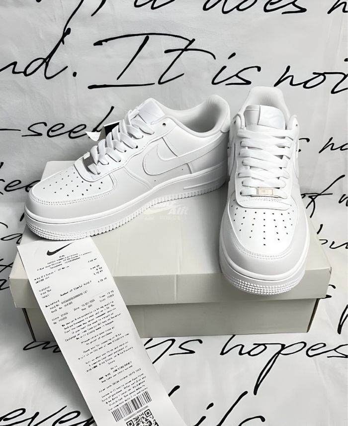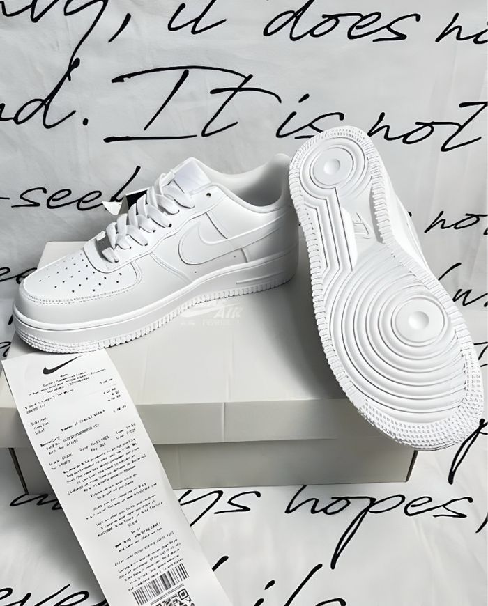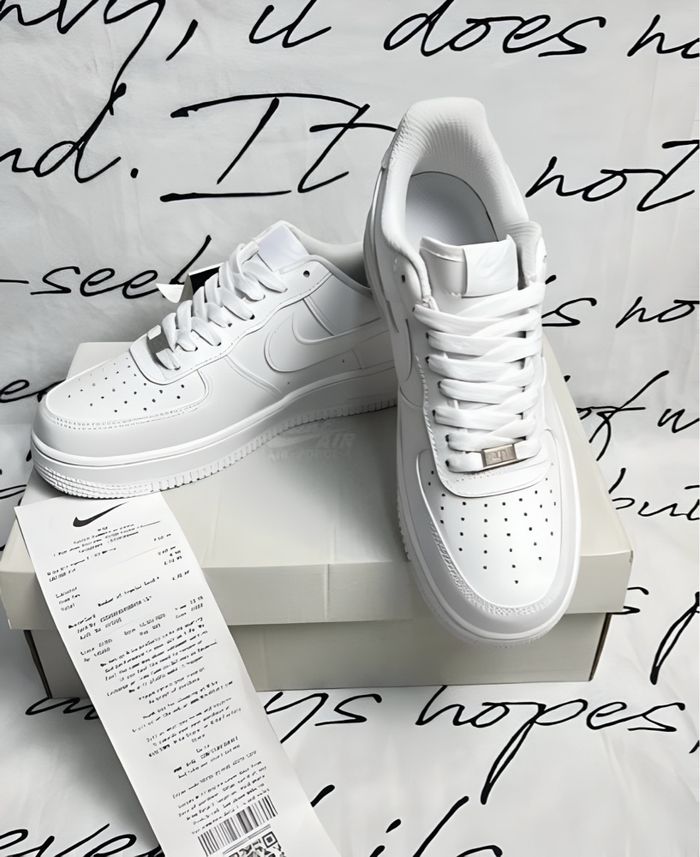 Paire de Nike Air Force 1 en cuir blanc, état neuf avec boîte et reçu visibles. ⭐️ État : 10/10 🎨 Couleur : Blanc 📦 Livraison rapide et soignée.