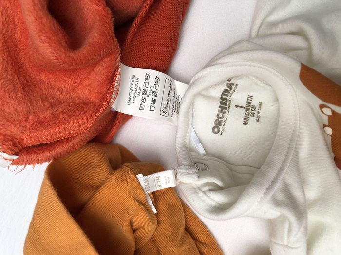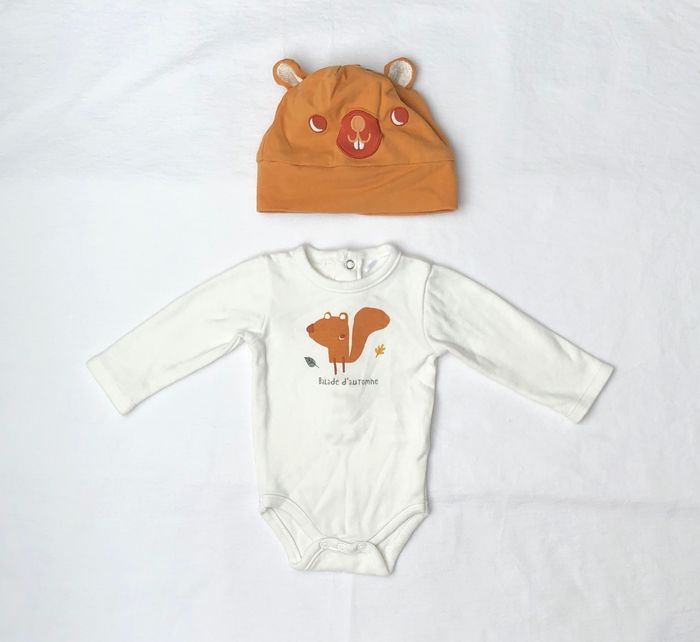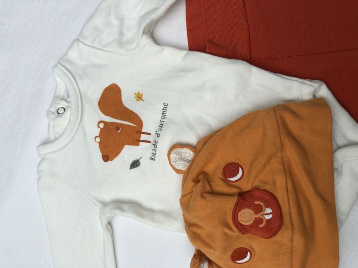 Ensemble trois pièces hiver Orchestra, Taille 1 mois/ 54 cm. -body écru, motif écureuil et feuilles, inscription « balade d’automne », Manches longues, En coton/ élasthanne. -bonnet doublé en coton, de couleur orangée, tête d’animal brodée et oreilles qui dépassent. Noté taille naissance/ 38 cm, taille un peu grand je trouve. -pantalon orange, revers au bas des jambes, Bien chaud, il est fourré. Lot en très bon état, sans trou ni tache. 🌸 Vous aimez cet article ? N’oubliez pas de visiter le reste de mon dressing en filtrant les tailles.