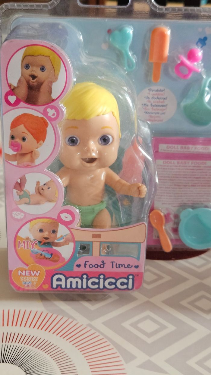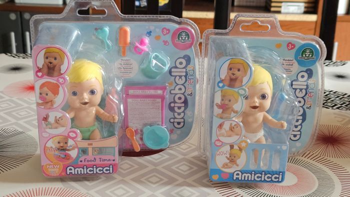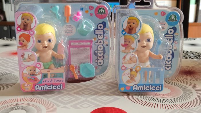Le lot comprend - Cicciobello Amicicci, Bébé avec Set repas et accessoires, Modèle Garçon Cheveux Blonds, - Cicciobello Amicicci, Bébé avec Expressions rigolotes et Accessoires Le tout est neuf et non ouvert. Envoi rapide et soigné. Remise en main propre possible à Longjumeau