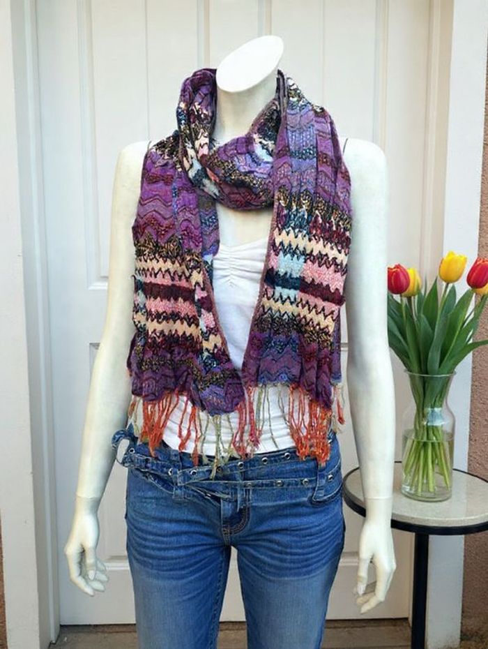 grande écharpe multicolore aux tons violets et prunes. Elle présente un bel aspect plissé et est agrémentée de franges dans le bas, ce qui lui donne beaucoup de style. État impeccable Longueur : 1,80 m