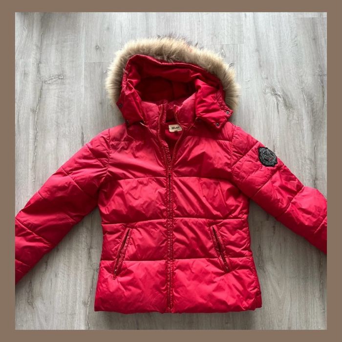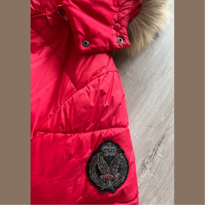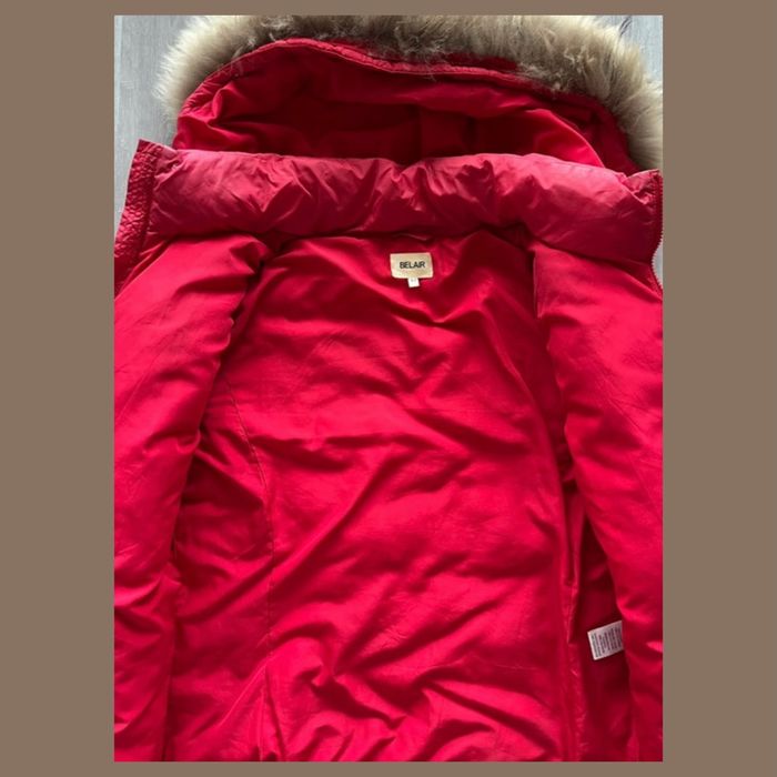 Doudoune Bel-Air rouge Taille 3 (M/L). Porté plusieurs fois, l’étiquette a légèrement jauni. La fourrure est intacte ainsi que le manteau.