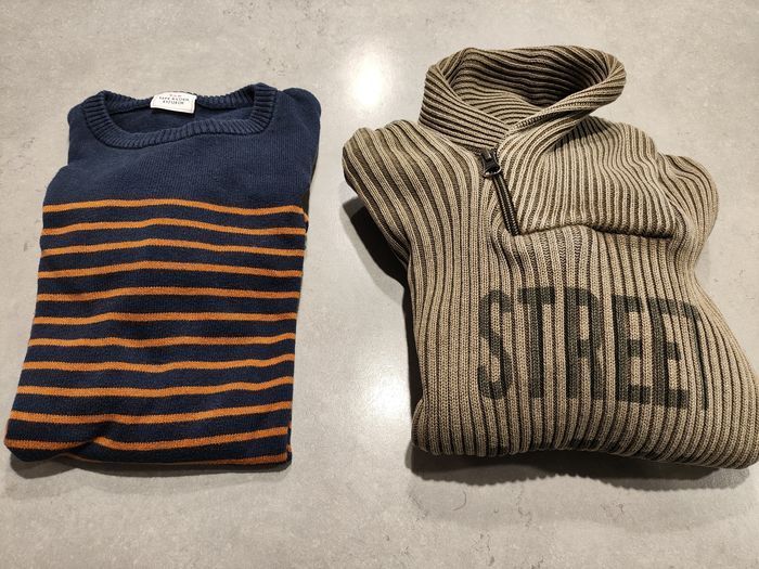 Je vends un lot de 2 pulls manches longues pour garçon, taille 8 ans / 128 cm, parfaits pour l’hiver : - Pull Tape à l’œil : bleu marine avec rayures orange, coupe classique, chaud et confortable. - Pull Orchestra : col montant zippé, tons beige foncé et marron 👉 Les deux pulls sont propres, sans taches ni trous, portés avec soin. D'autres vêtements de cette taille sont disponibles sur mon profil
