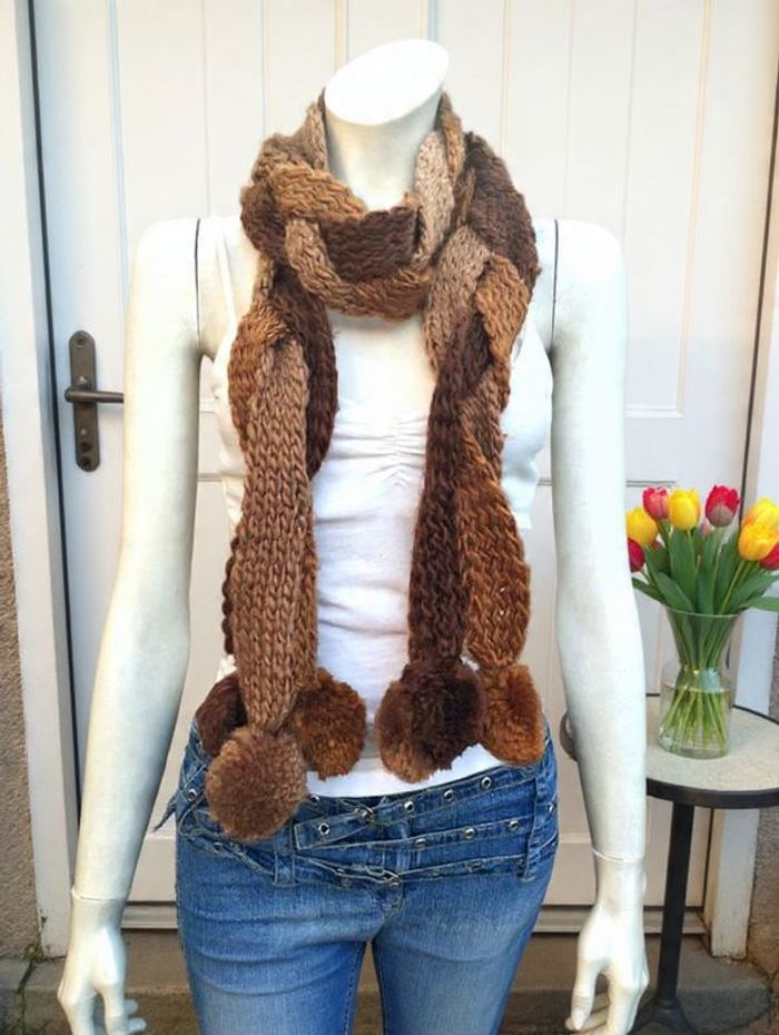 Écharpe longue tressée en laine maille tricolore État neuf pompons beige marron