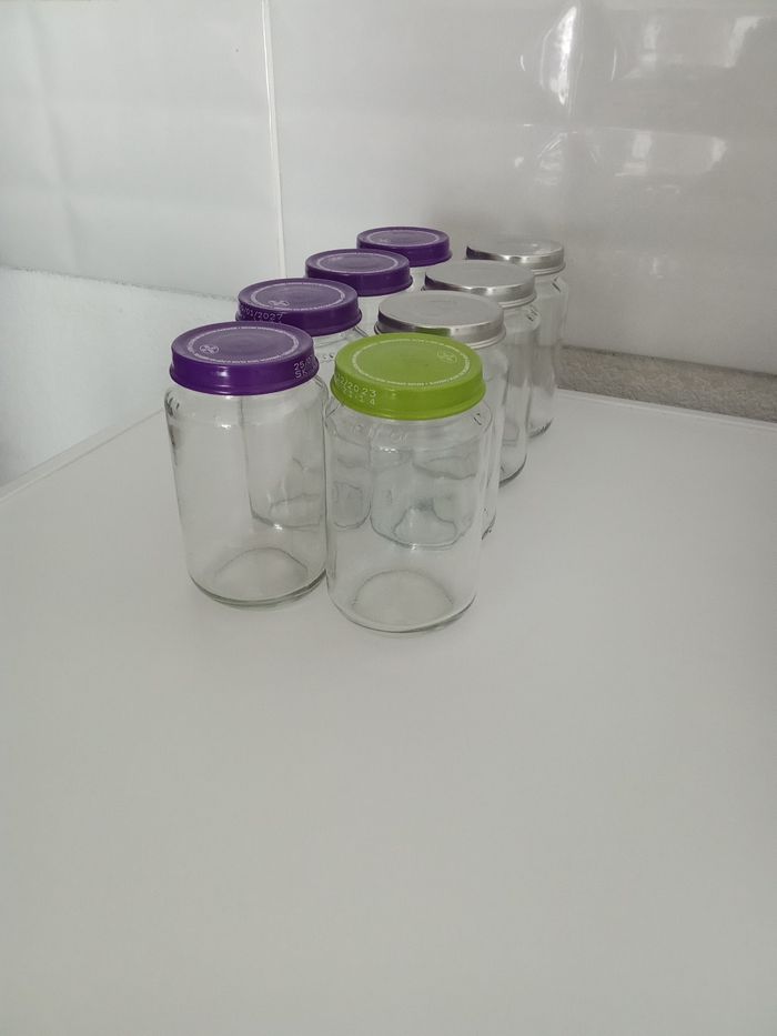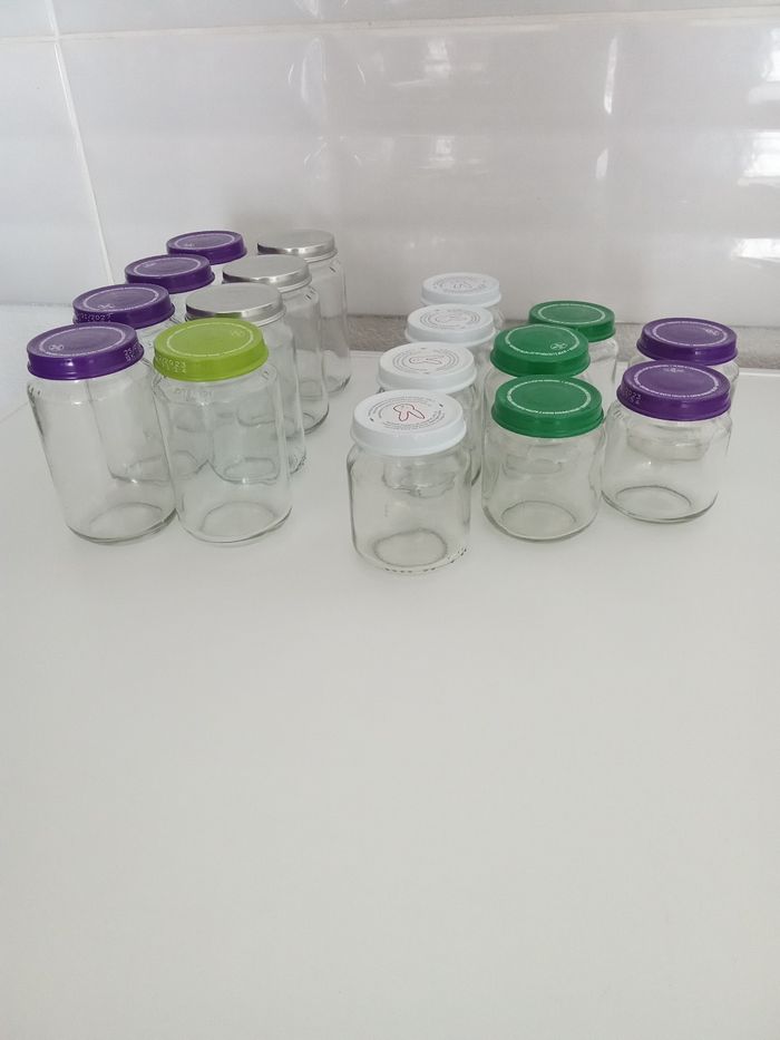 Lot de 17 pots en verre : - 8 pots de 200g chacun environ, - 9 pots de 130g chacun environ. Très bon état.