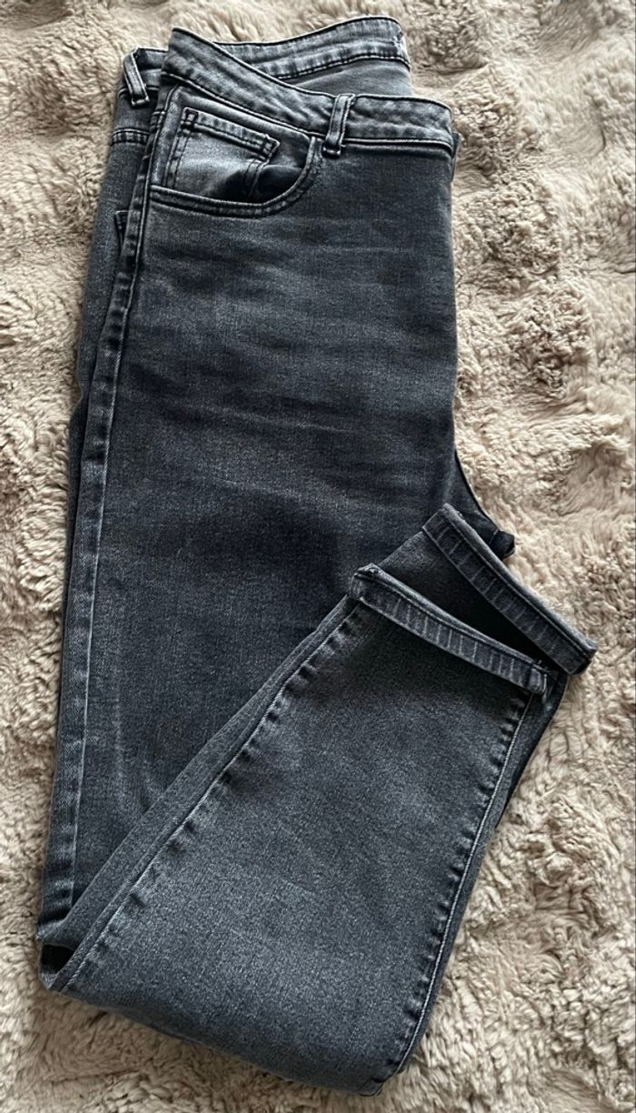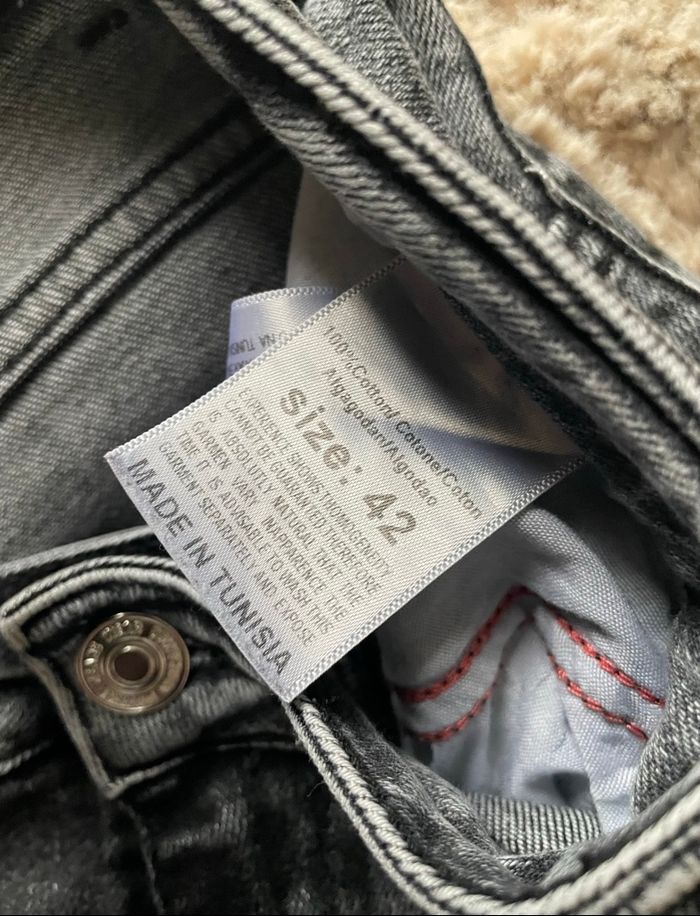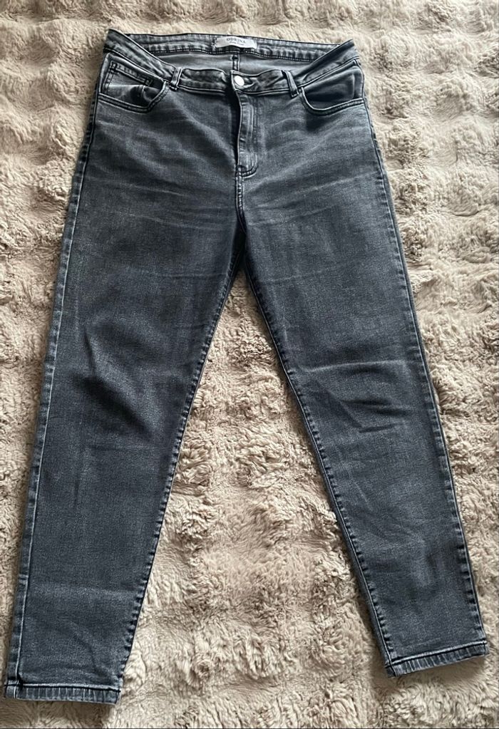 Jean gris taille 42 femme deux poches à l’avant deux poches à l’arrière fermeture éclair +bouton Dimensions à plat longueur 99 cm Entre jambes 67 cm largeur cuisse 29 cm Porté petit défaut de fabrication il reste en bon état