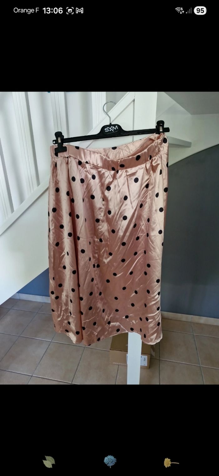 Jupe satiné, rosé a pois noir. Taille 0XL 38cm De Taille 80cm de longueur