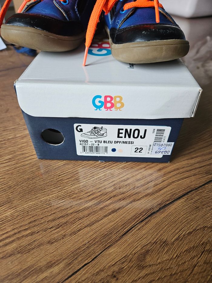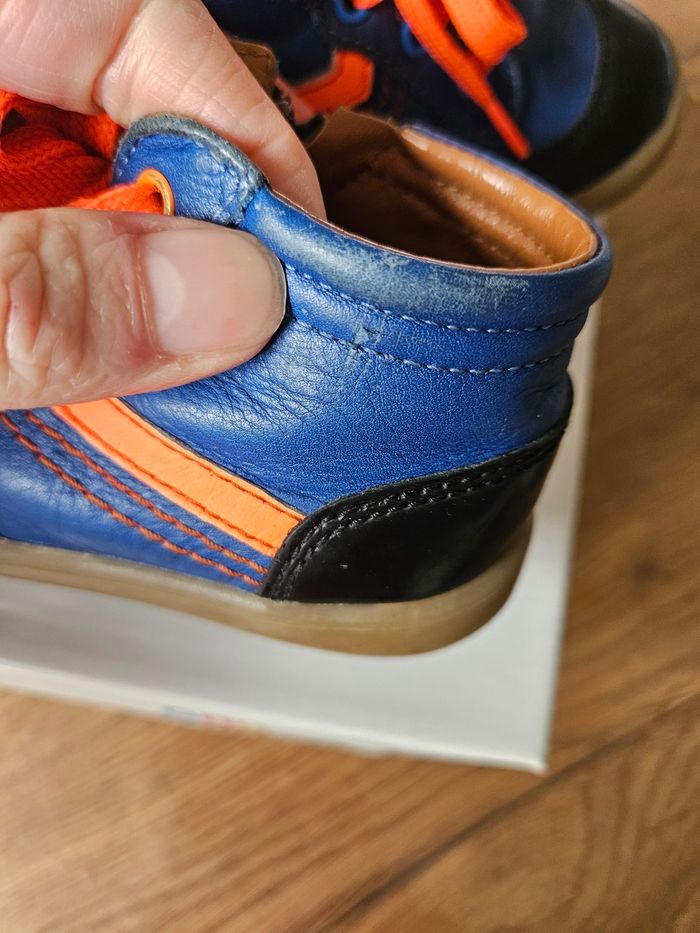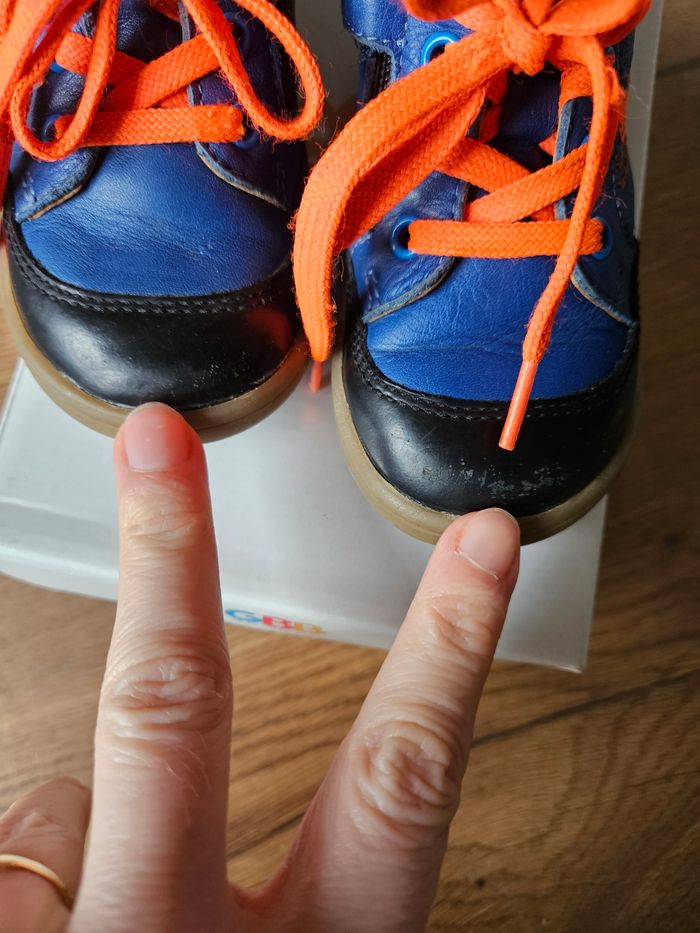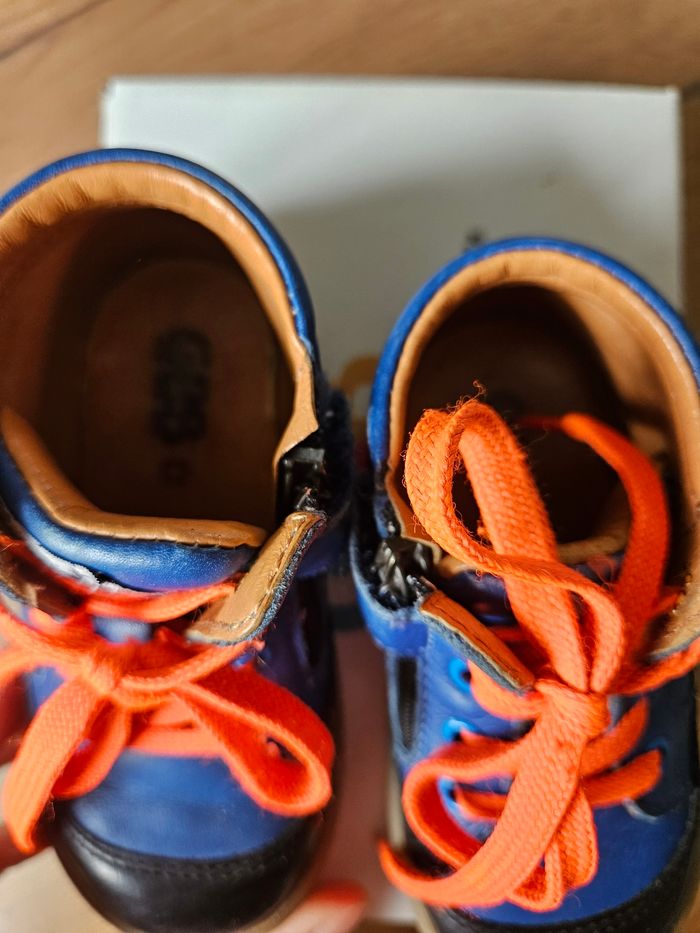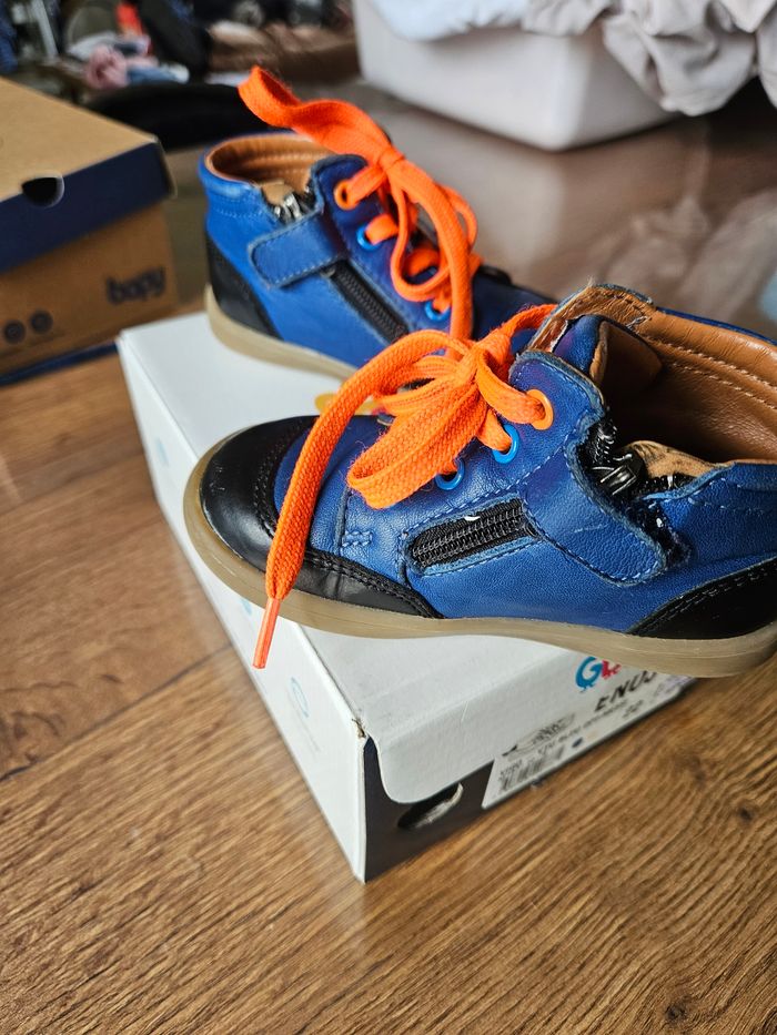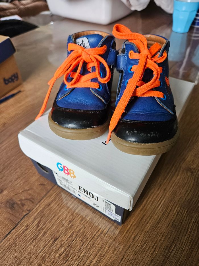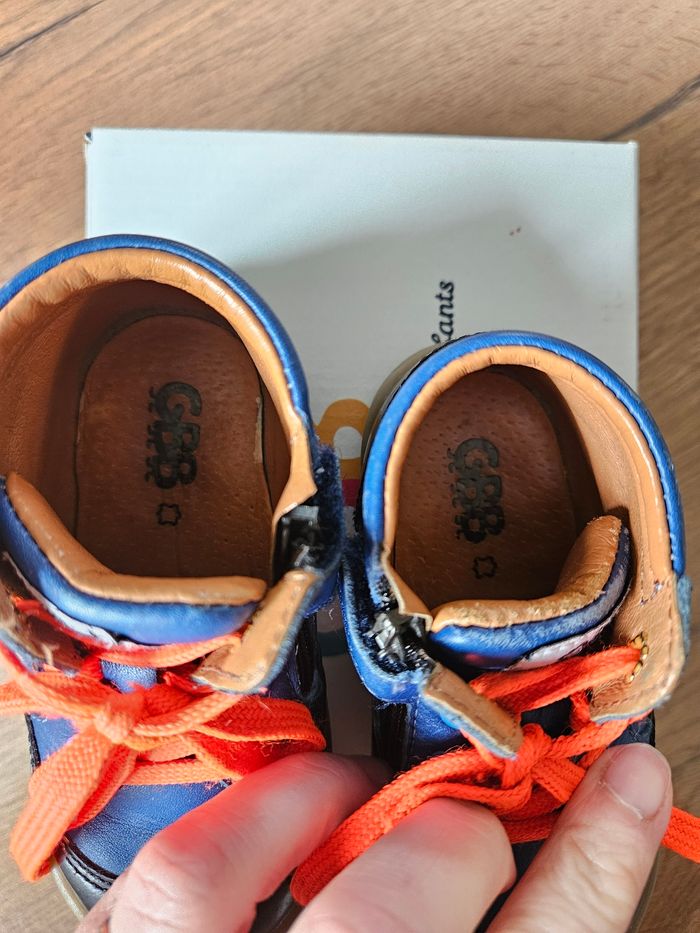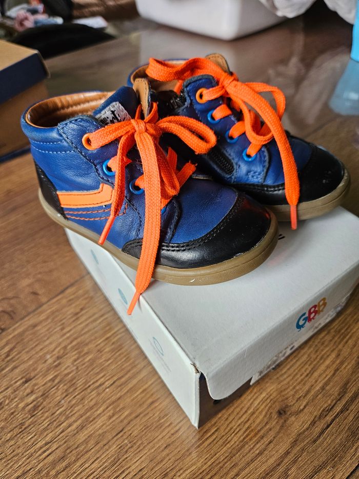 Chaussures en cuir GBB Couleur bleu roi et noir avec liseré orange Portées mais en très bon état Légère griffes sur le bout et le côté voir photos.