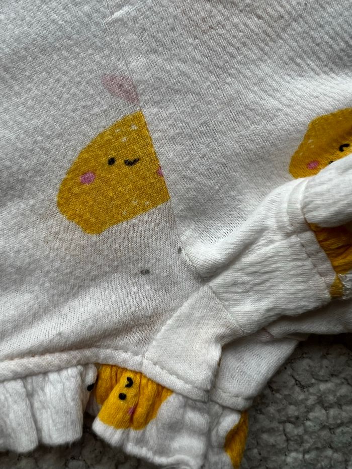 Barboteuse imprimée citron, en coton stretch (maille froissée), encolure ronde, manches extra-courtes volantées, ouverture avec 3 boutons au dos, base volantée, entrejambe pressionnée. Prix neuf : 10€. Marque Kiabi. Taille 18 mois / 86 cm. En très bon état, petite tache grise au niveau des boutons pressions (voir photos). Poids article seul : 75g. N’hésitez pas à me poser des questions, me demander des photos supplémentaires 👧🏼