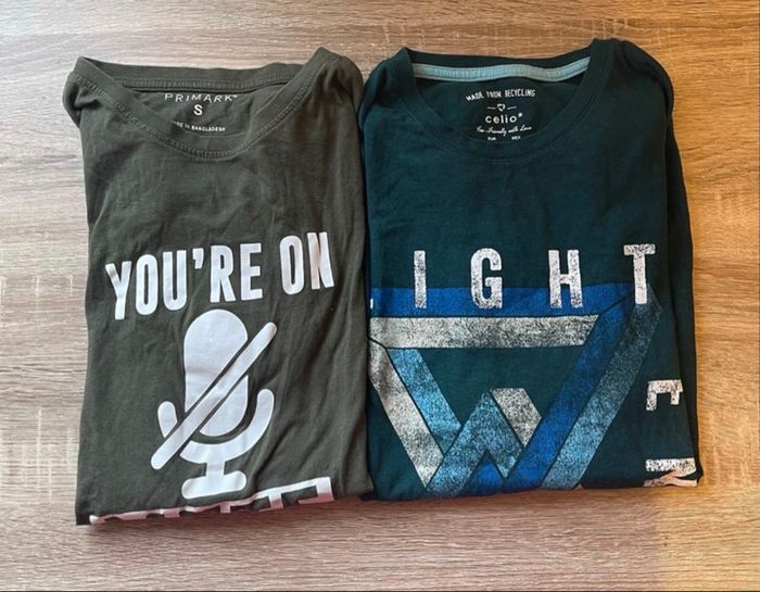 Vends lot de 2 t-shirt en taille S de la marque Celio et Primark. Très bon état. Prix négociable. Maison non fumeuse et s