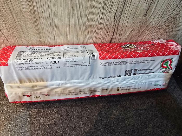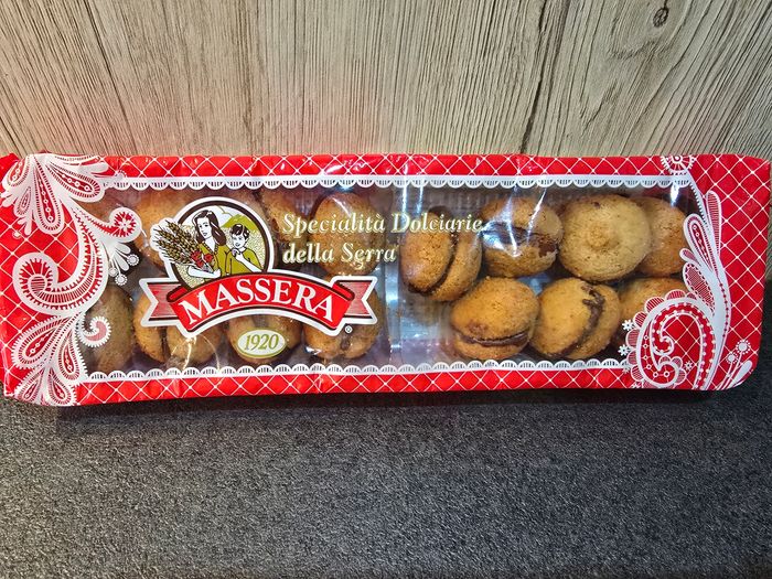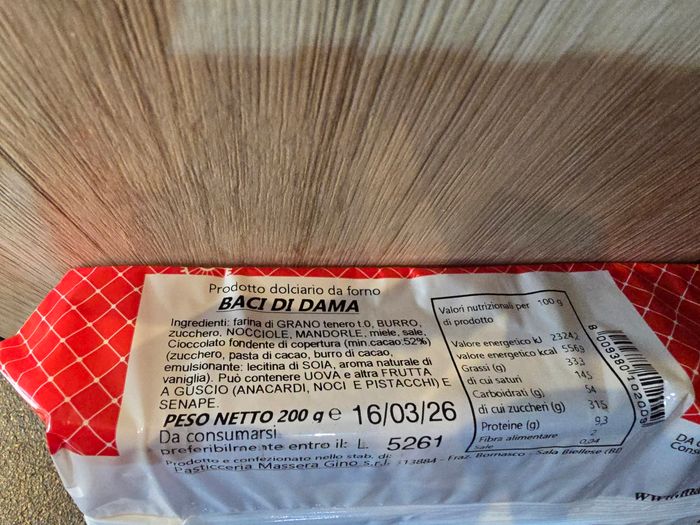 Baci di dama, biscuits de spécialités italiennes. Pas trop sucrées, deux demi-sphères de noisettes réunies par un filet de chocolat. Poids : 200g DLC : 16/03/2026