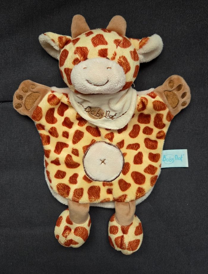 Doudou plat marionnette girafe en velours de couleur beige , jaune et tachetés. Bandana en velours " Baby Nat " autour de son cou