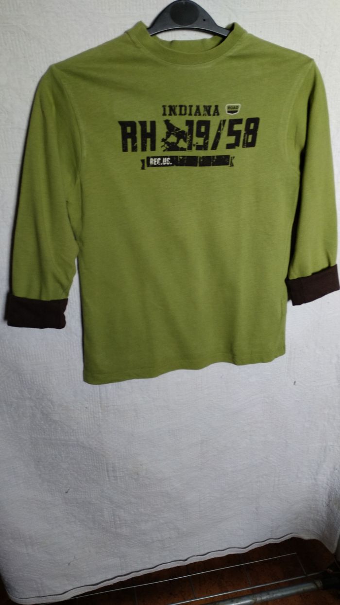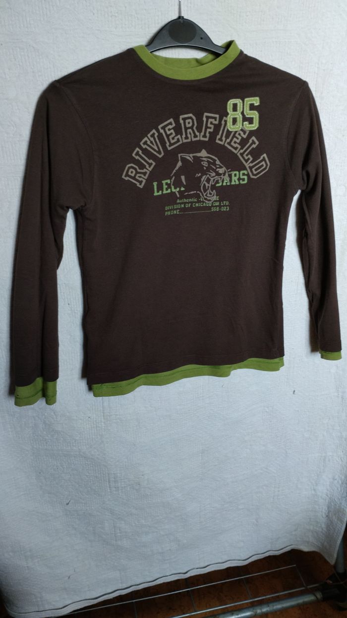 Un côté vert avec motif “Indiana Road RH 19/58”. L’autre côté brun, style sport, avec imprimé “Riverfield Leopards” et tête de léopard. Col, poignets et bas contrastés en vert. Très bon état. #enfant #garçon #tee-shirt #réversible #10ans #Indiana #Riverfield