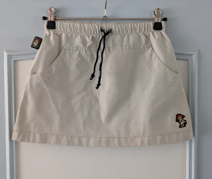 Jupe de marque DDP, taille 8 ans, 80% coton, 20% polyamide. Taille élastique avec lanière, couleur crème, 2 poches. Motif coté gauche.