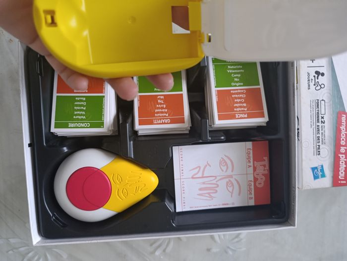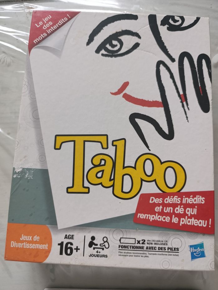 jeu Taboo divertissement à partir de 16 ans Hasbro en bon état complet avec notice Buzzer fourni avec piles 270 cartes un sablier et un carnet pour noter les scores
