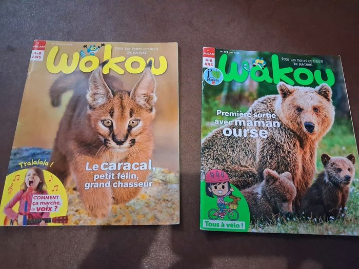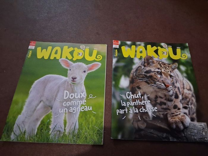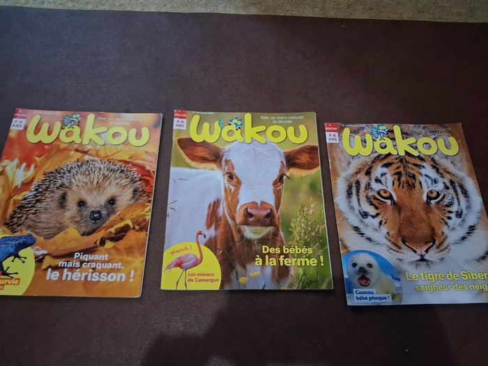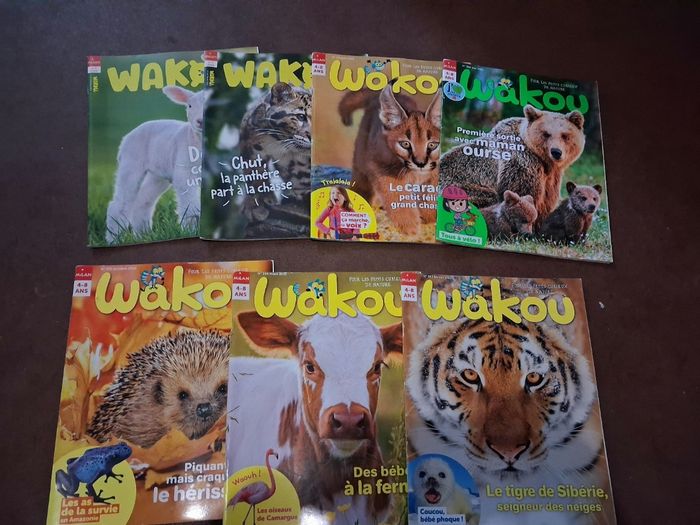 Lot de 7 magazines jeunesse wakou sur les animaux.pour enfants de 4 à 7ans.les 2 premiers n'ont plus le poster, les 2 suivants n'ont plus les "cadeaux" style cartes ou marques page et les 3 derniers ont le coloriage de fait et 1 jeu fait.tous sont en bon état.