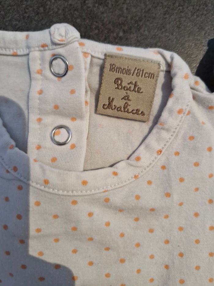 T-shirt manches courtes fille 👧 Taille 18 mois Marque : boîte à malices Blanc et orange Réduction sur les lots activé ☺️ Bac4