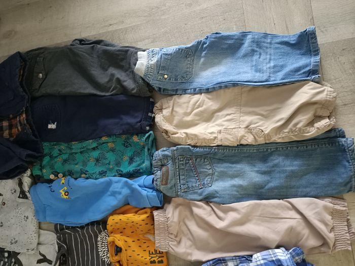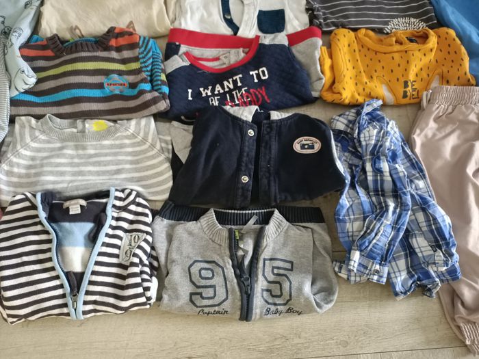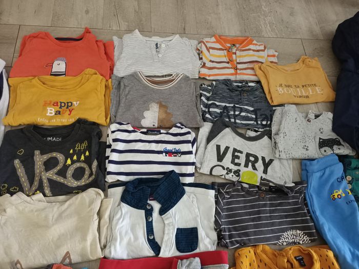 Lot de 35 vêtements garçon printemps et hiver en taille 18 mois 14 t-shirts manches longues 4 pulls et sweats 3 vestes à capuche et gilet 1 chemise manches longues 8 pantalons et jogging (dont 4 doublés, chauds) 1 manteau 2 bodys 1 pyjama velours 1 combinaison pyjama velours Tout en très bon état Sergent major, Dim, Kiabi, orchestra, bout'chou, obaibi...
