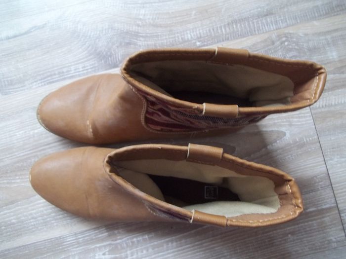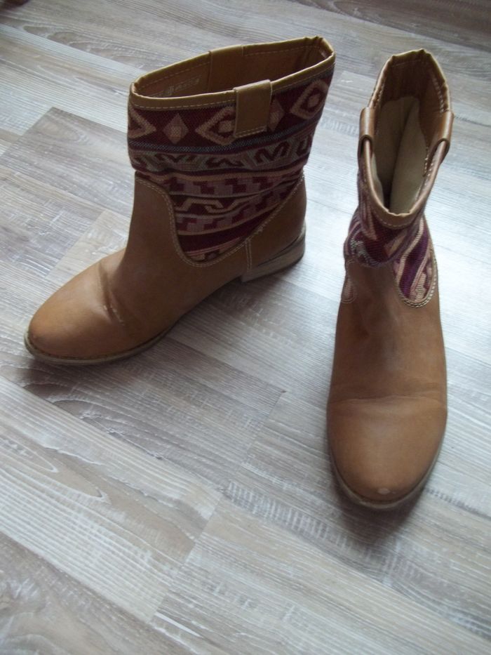 Bottines à petits talons (1,5 à 2 cm de bois ou aspect bois ?) en (simili ?) cuir marron clair et tige en tissu multicolore. Hauteur de tige environ 16 cm, largeur haut tige environ 16 cm, longueur semelle extérieure 26,5 cm. Plutôt petit 39. Peu portées mais "cuir" marqué et craquelé par endroits (cf photos). CH14