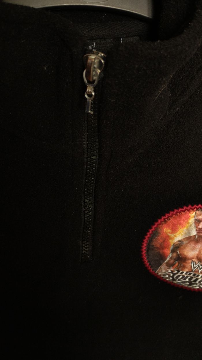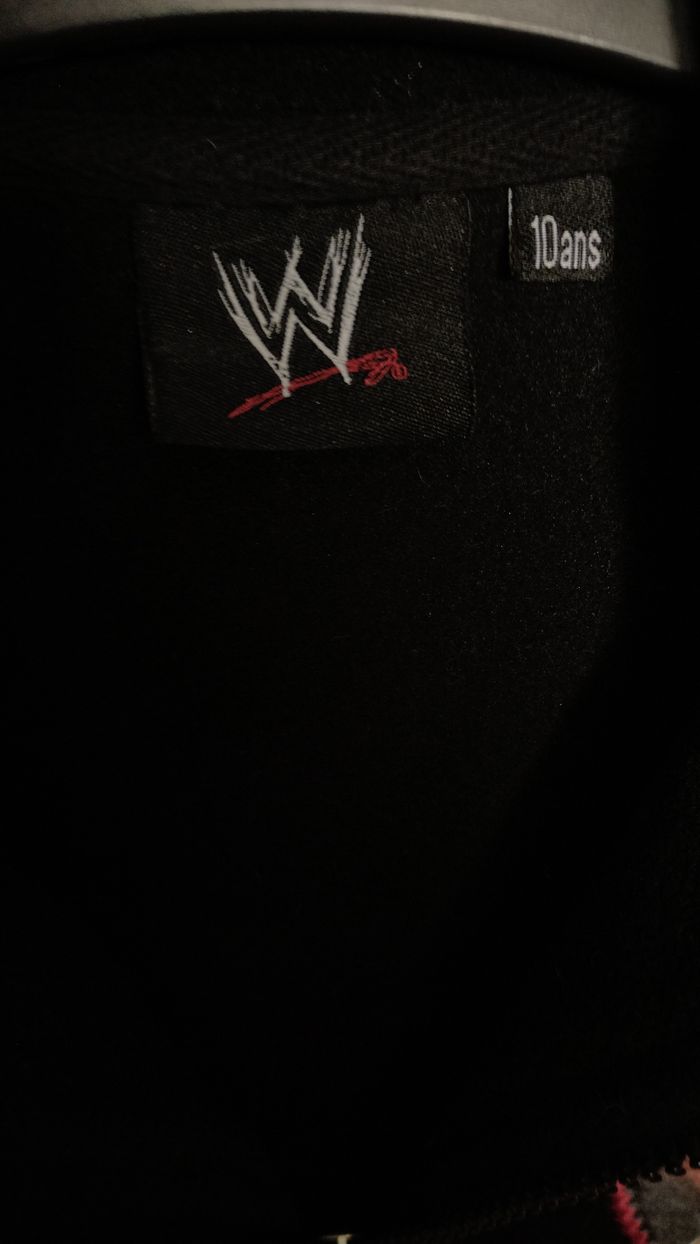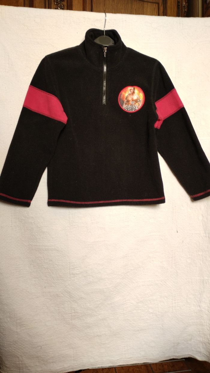 Détails rouges sur les manches et les coutures. Patch Randy Orton WWE sur la poitrine, style sport/lutteur. Zip demi ouverture, col montant. Marque : WWE
