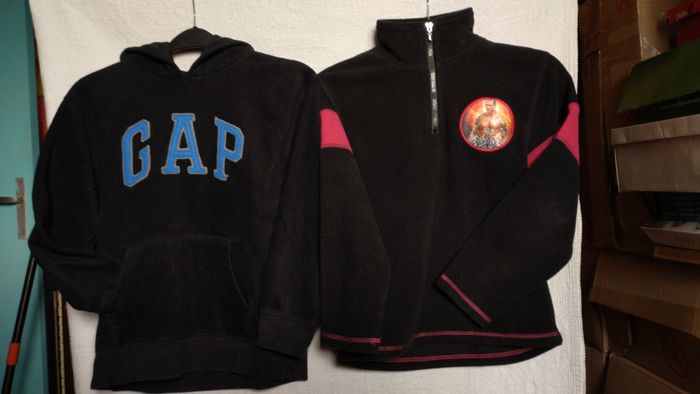 – 1 sweat à capuche noir GAP Kids, logo bleu brodé, doublure capuche coton. – 1 polaire noire et rouge Randy Orton WWE, col zippé, patch lutteur.