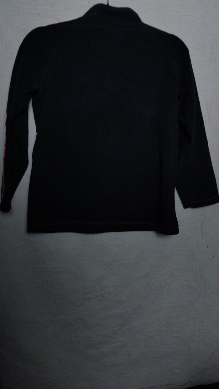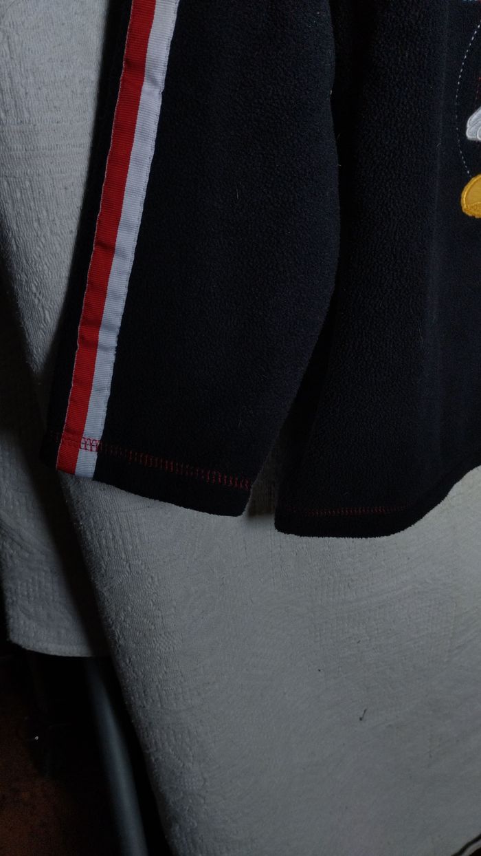 Polaire noire et rouge, taille 10 ans, motif Mickey brodé. Rayures rouges et blanches sur les manches, zip rouge, col montant. Mickey souriant avec lettrage “MICKEY” sur la poitrine.
