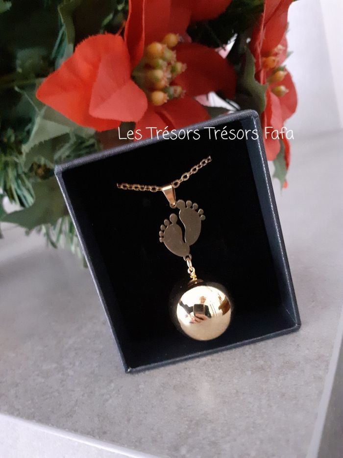 🤰 Bola de grossesse composé : - d'une chaîne en acier inoxydable doré d'une longueur d'environ 105 cm. - d'une boule sonore plaquée or de diamètre 20 mm. - d'un connecteur pied de bébé en acier inoxydable doré.