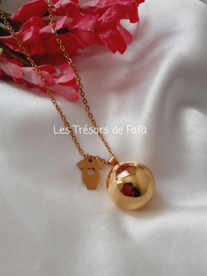 🤰 Bola de grossesse composé : - d'une chaîne en acier inoxydable doré d'une longueur d'environ 105 cm. - d'une boule sonore plaquée de diamètre 20 mm. - d'un pendentif en acier inoxydable doré.