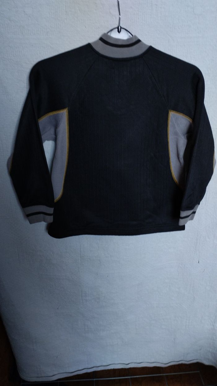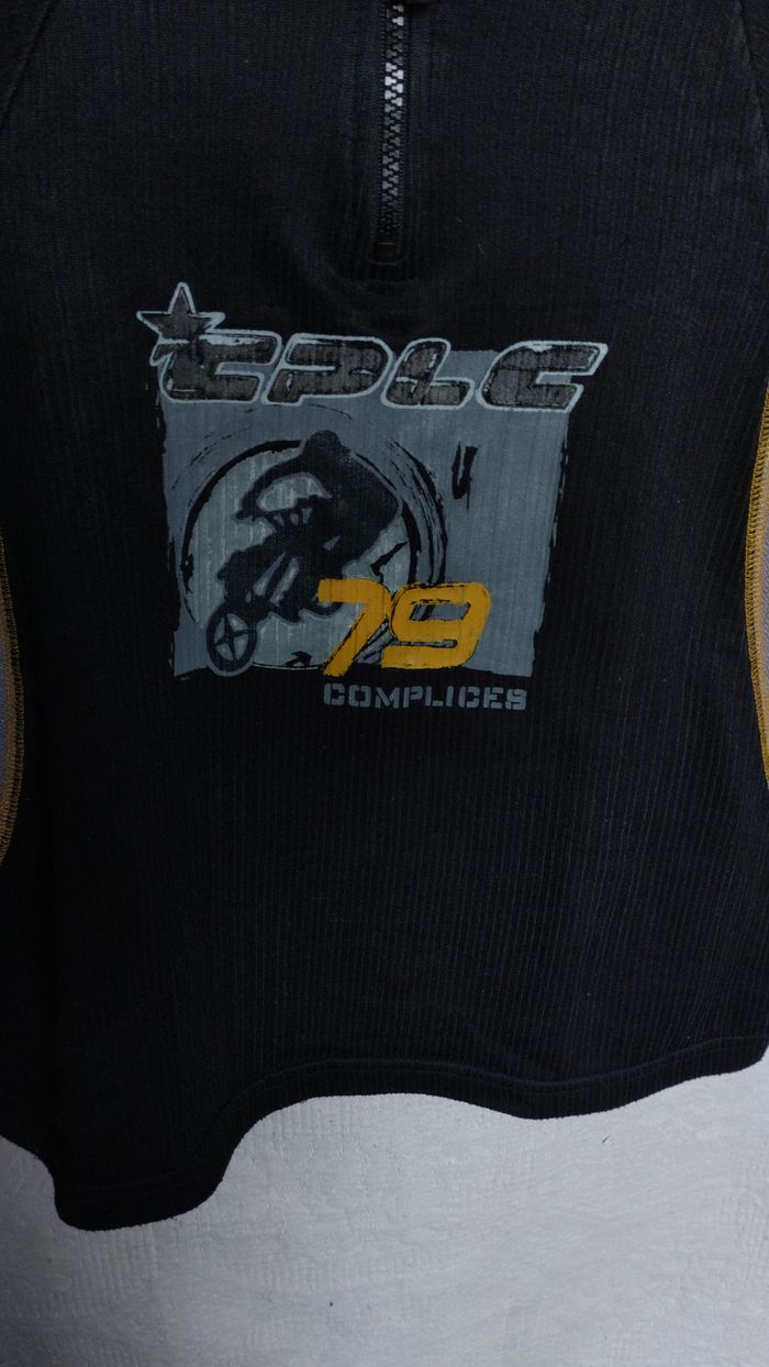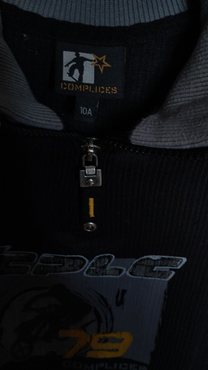 Sweat garçon, taille 10 ans, marque Complices. Couleurs : gris et noir, avec détails jaunes et blancs. Motif vélo “TPLC 79” sur le devant. Col zippé, manches longues, style sport. Matière non spécifiée, mais douce et confortable. Très bon état.