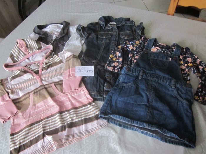 36m, robe mc jean + robe salopette jean + robe sans manche + robe à capuche + 2 hauts ml, happy girls club, kiabi, h&m