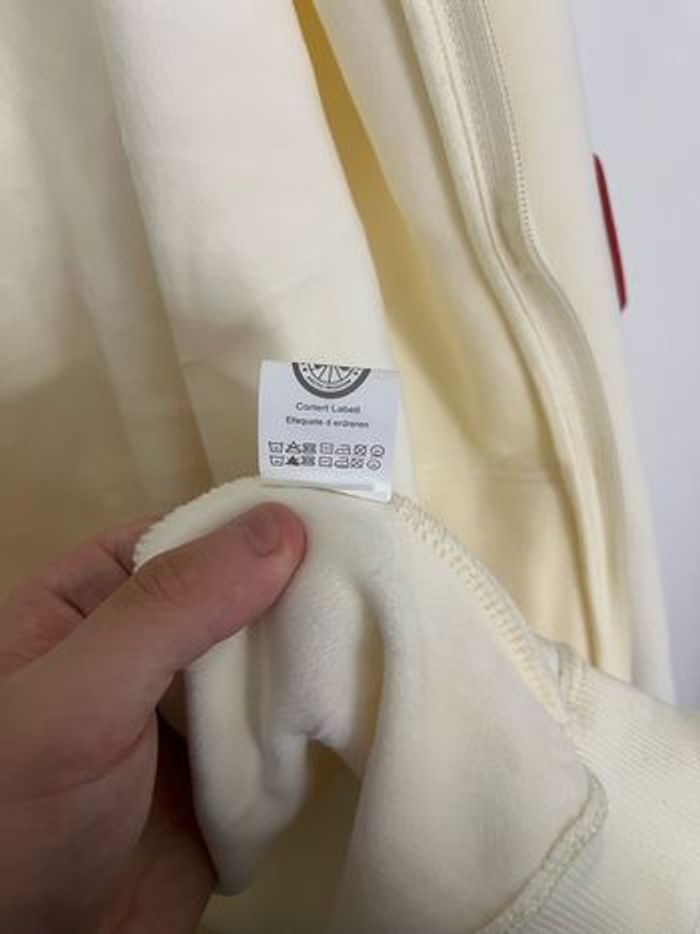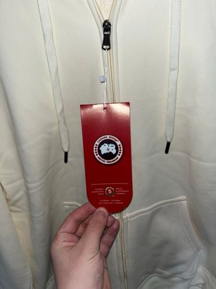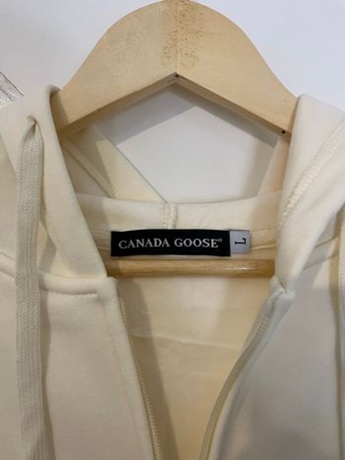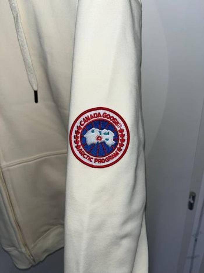 Sweat à capuche Canada Goose crème, neuf avec étiquette. Logo distinctif sur la manche. ⭐️ État : 10/10 (neuf avec étiquette) 🎨 Couleur : Blanc crème 📦 Livraison rapide et soignée