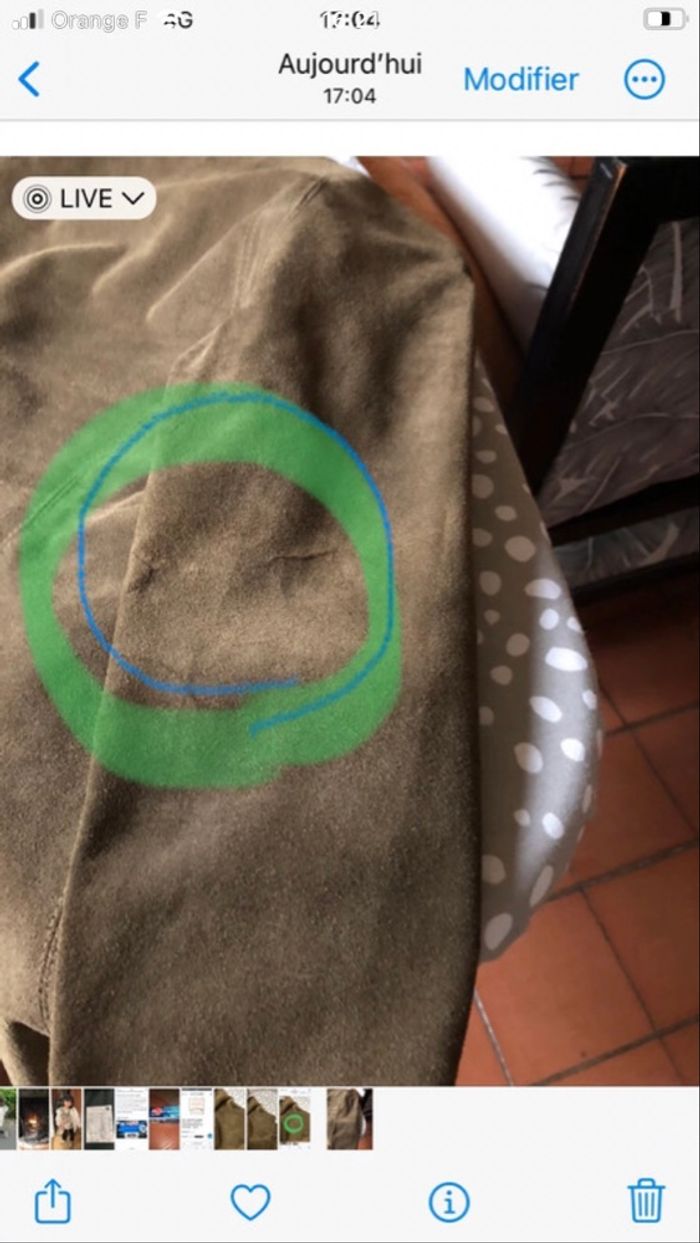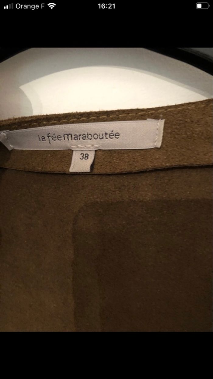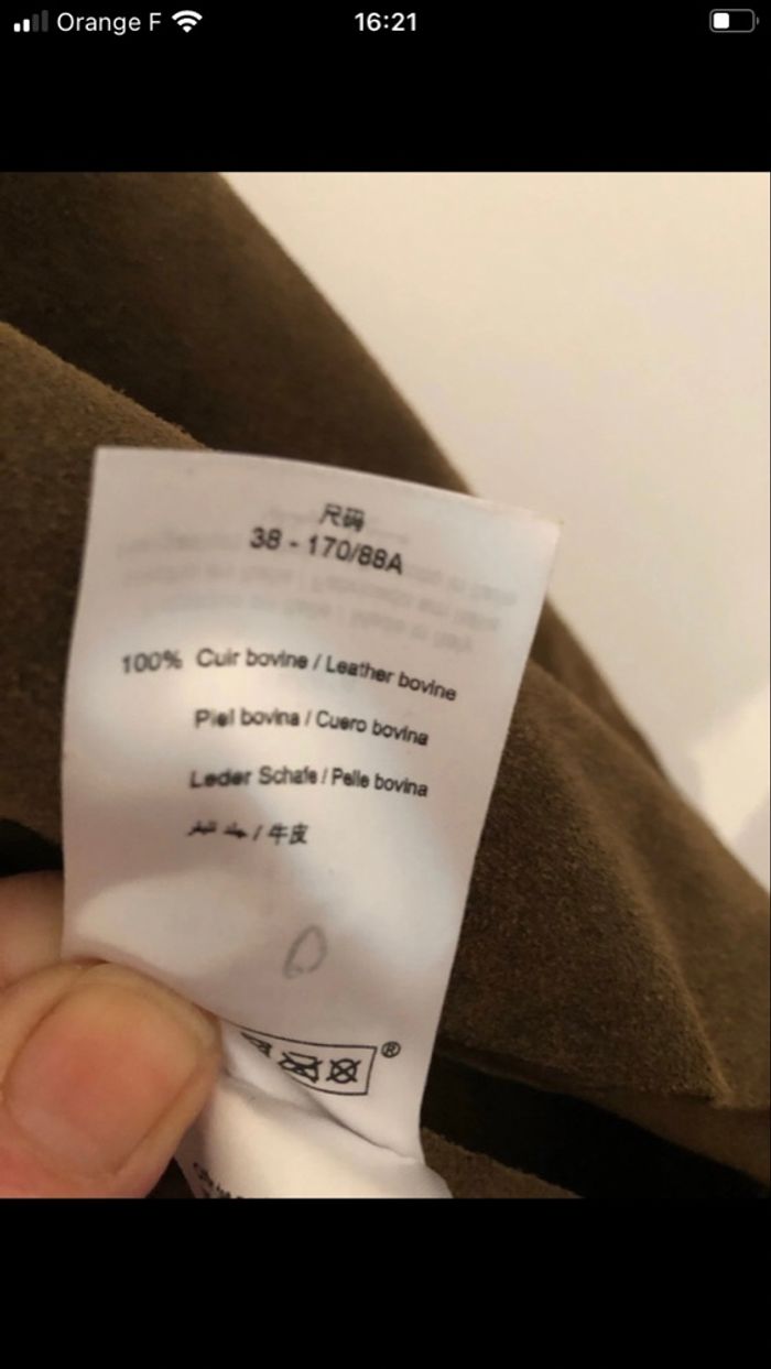 Manteau bord à bord col rond en daim kaki 100% cuir bovine non doublé Les imperfections signalées sur photo sur manches sont d’origine malheureusement c’est du cuir de bovin et les imperfections viennent delà Je vous rassure porter cela ne se voit pas Longueur au genou 84cm Il est indiqué taille 38 mais taille petit taille 36 Ne pas porter sous la pluie