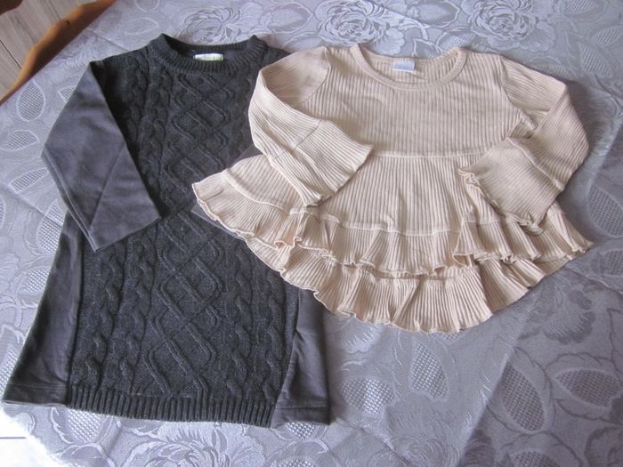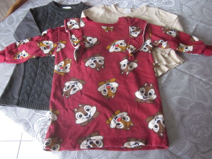 36m, gilet boléro neuf kiabi + robe disney h&m + haut tunique + robe ml vert baudet