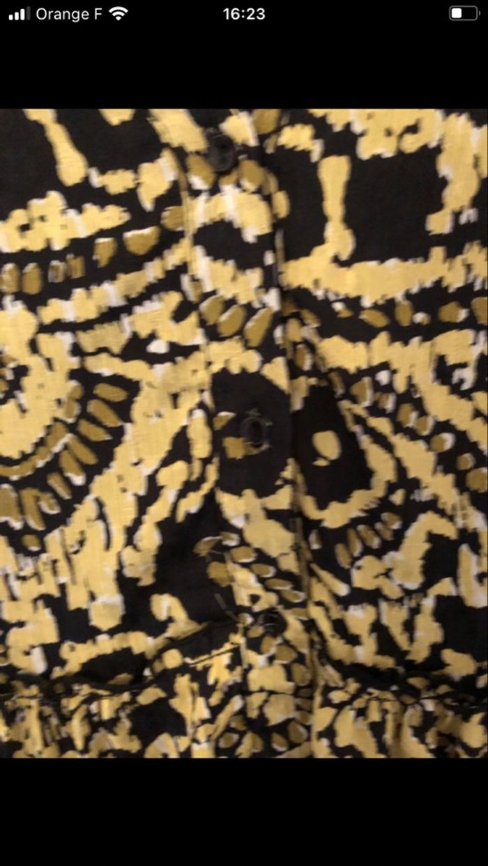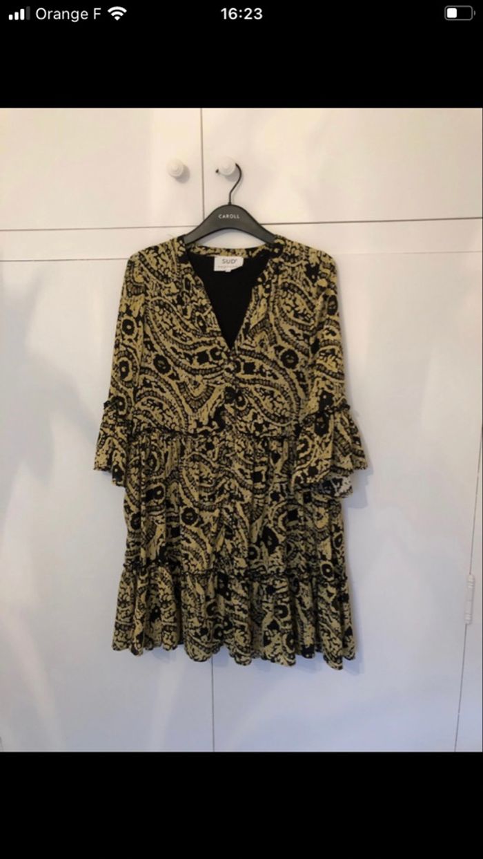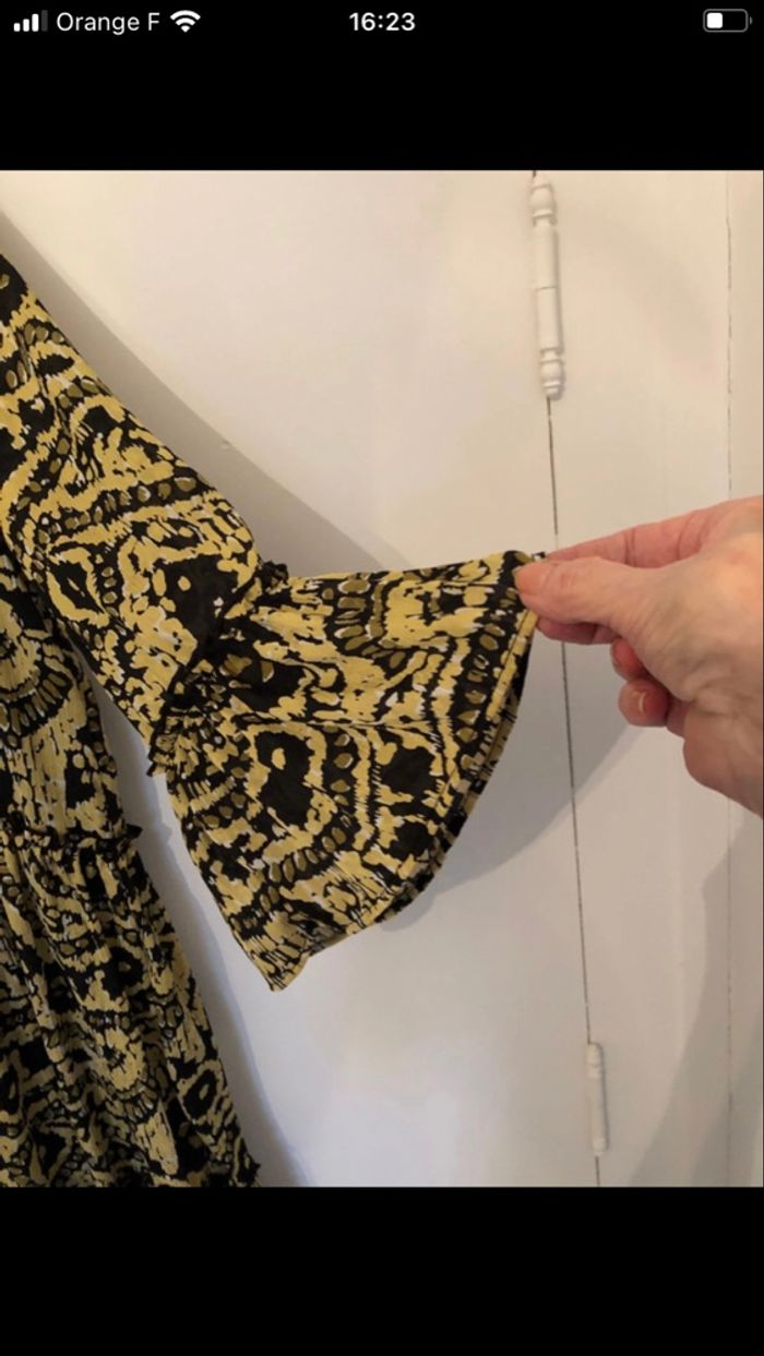 Très peu portée Très bon état 100% polyester doublée noir Robe à volants fluide longueur 88cm Manches à volants 3/4