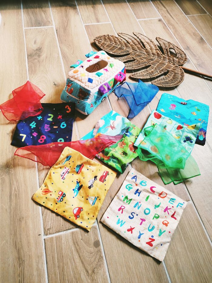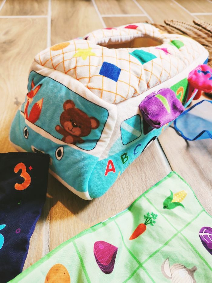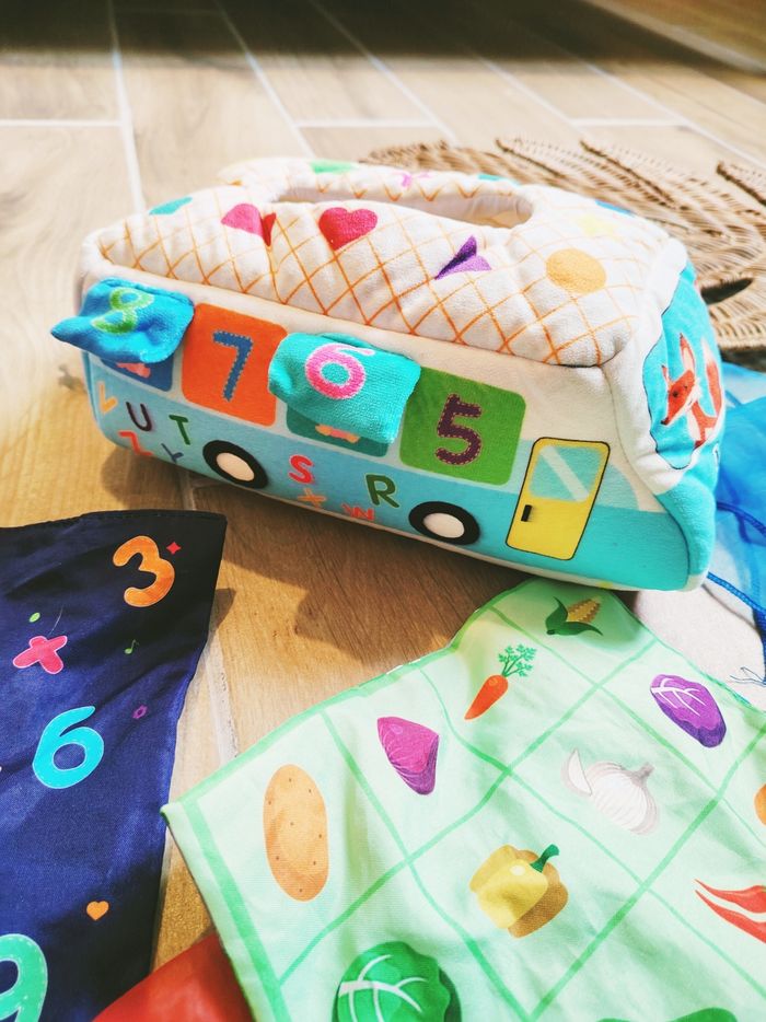 Un jouet éducatif complet et tout doux qui remplace avantageusement les vraies boîtes de mouchoirs !