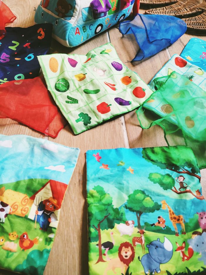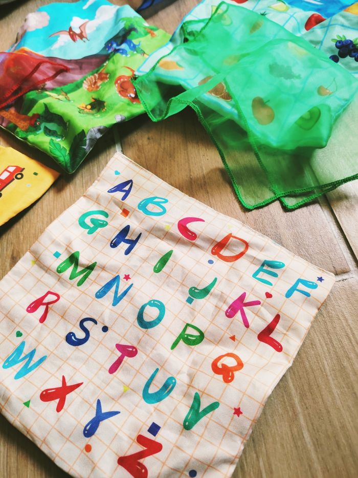 ✨ Tissus thématiques illustrés recto verso. Des carrés de tissu soyeux avec des motifs variés pour apprendre en s'amusant :
