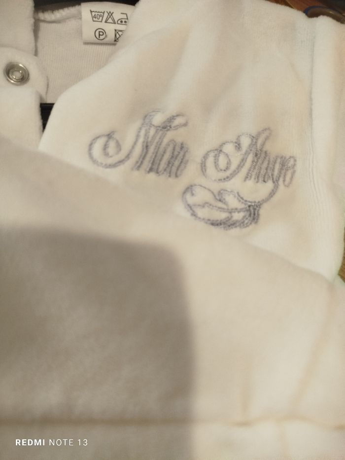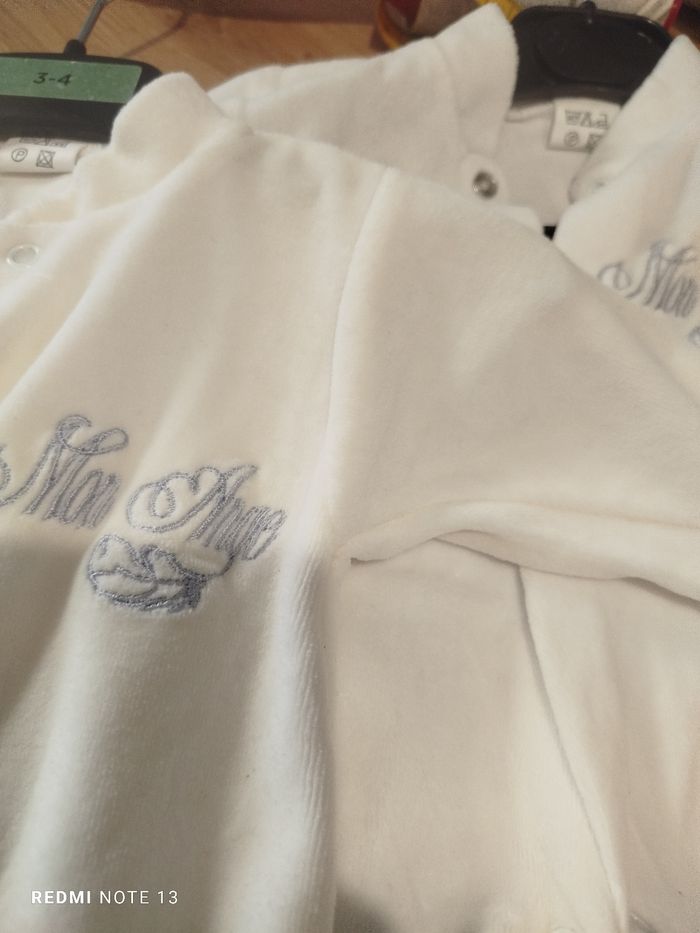 #kytie1moisgarcon. 2 grenouillères taille 1 mois en velours neuve pro des mon ange une et blanche une est écru en état neuve ref 90