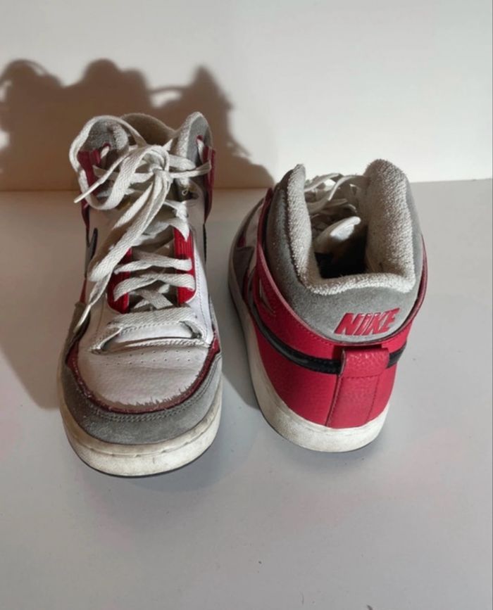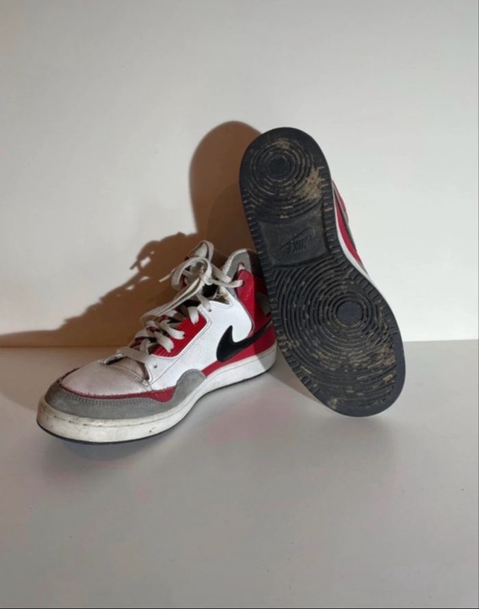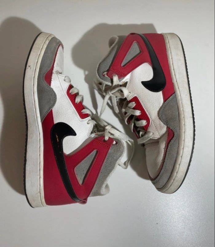 Chaussures Nike Air Force 1 en rouge, blanc et gris. Usure visible sur la semelle et légères marques sur le dessus. ⭐️ État : 6/10 🎲 Taille : 40 🎨 Couleur : Rouge, blanc, gris 📦 Livraison rapide et soignée