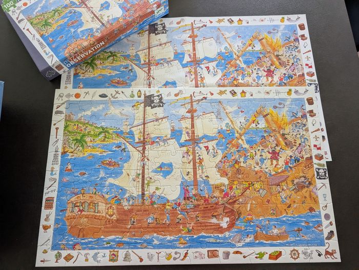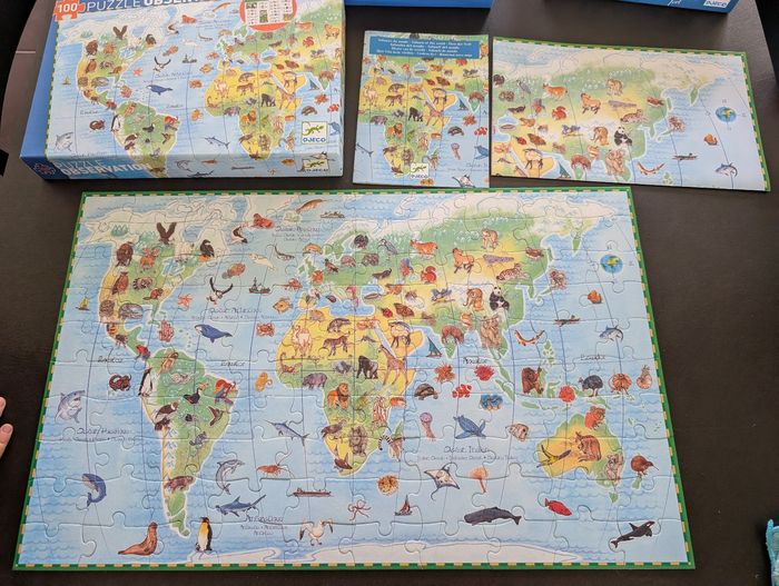 3 puzzles Djeco 100 pieces en excellent état. Complets. 1 puzzle Auzou, 140 pièces. Jamais fait.