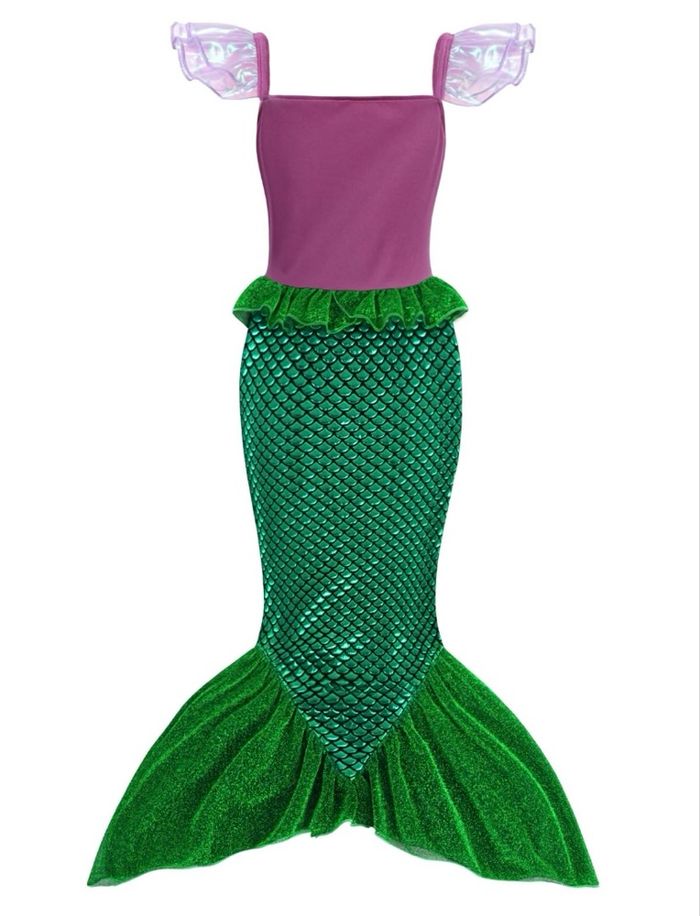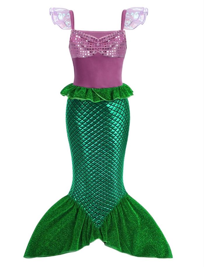 Déguisement sirène violette et verte et ces accessoires (couronne, baguette, gants, bijoux, serre tête). 2 tailles disponibles : - 3-4ans : longueur de la robe 80cm, - 5-6ans : longueur de la robe 90cm, Vendu dans leur pochette d’emballage d’origine, idéal pour faire un cadeau ! Expédition rapide après votre commande.