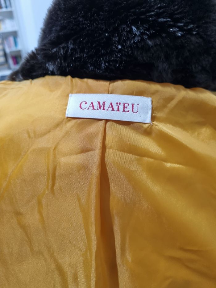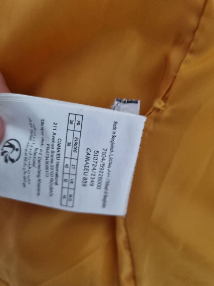 Doudoune camaïeu jaune moutarde Très bon état, petit défaut sur le simili autour de la poche droite (visible sur la photo 7. Doudoune femme avec capuche Fermeture par Fermeture éclair et pressions. Deux poches zippées. Taille 38