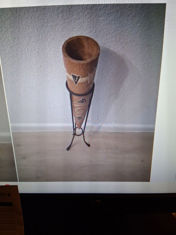 Vase ":oriental " forme icône en bois sur socle en fer forgé noir Hauteur : 62 cm Diamètre du vase : 9 Excellent état