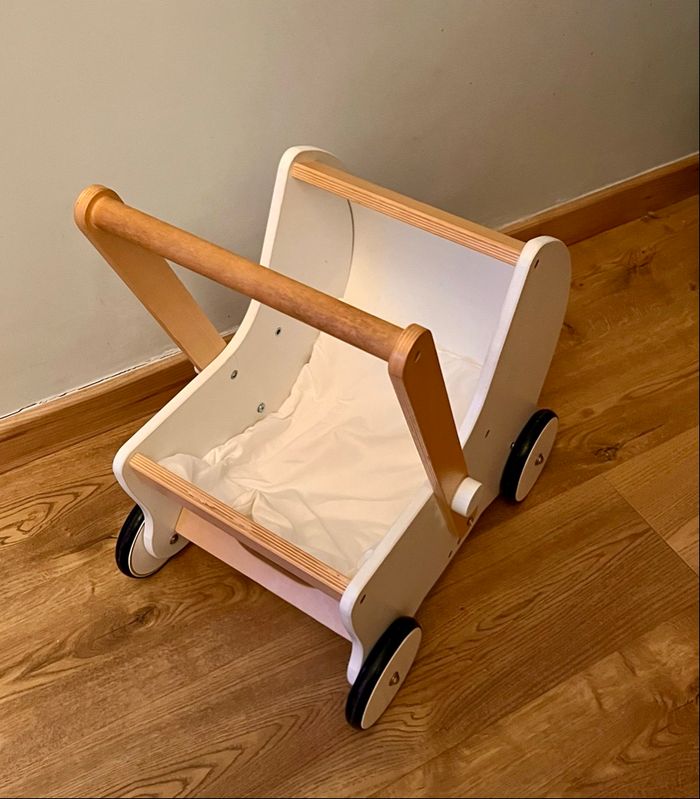 Le landau de marche 2 en 1 en bois de vertbaudet aide l’enfant dans ses premiers pas tout en se baladant avec sa poupée. Le landau peut se transformer en poussette en retournant la poignée en bois. Il mesure 44.5×32.5×52 cm