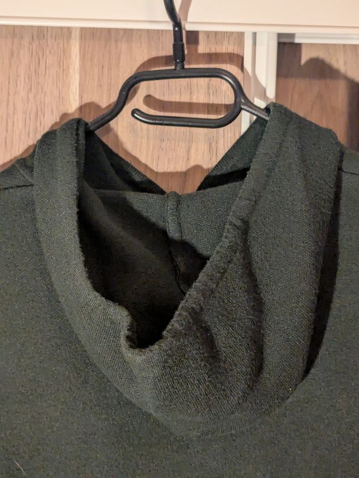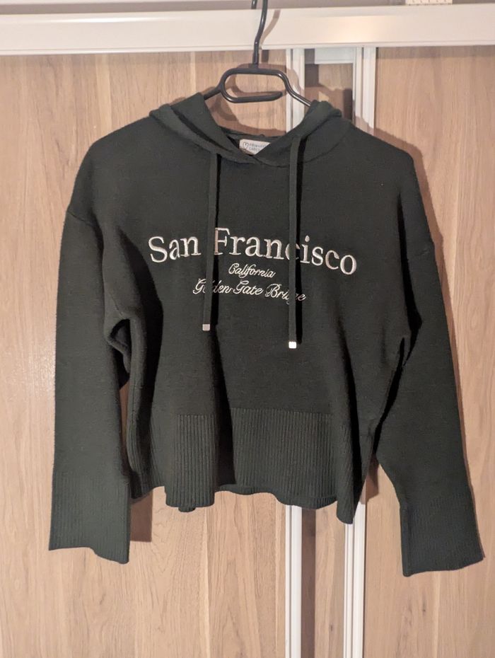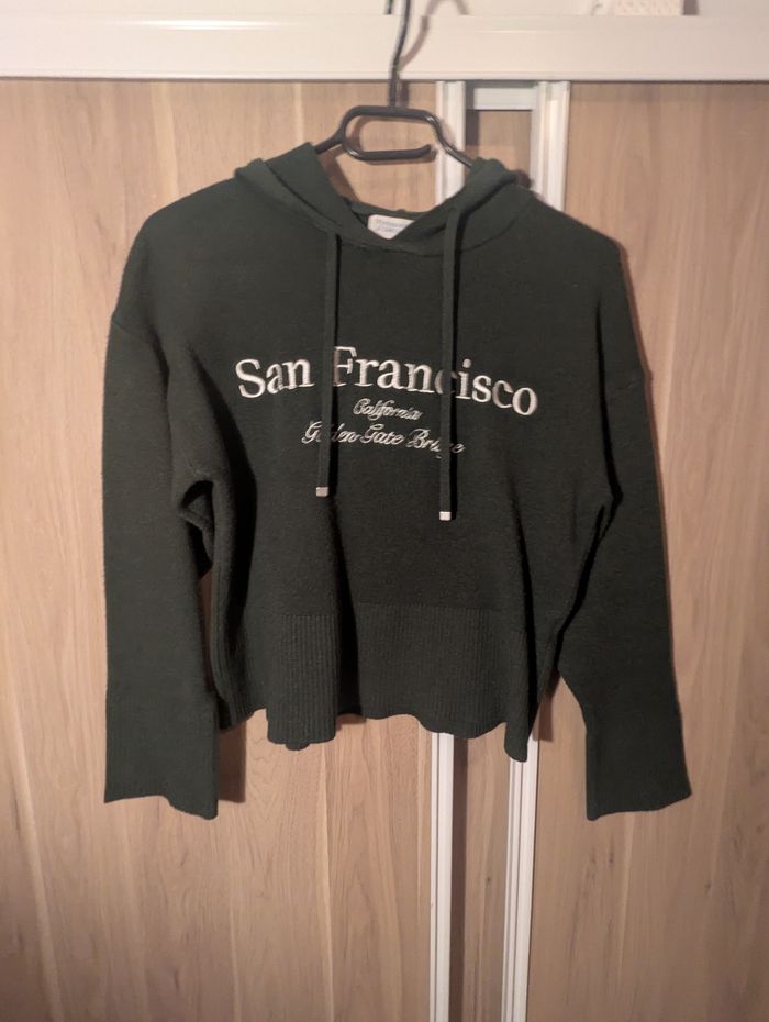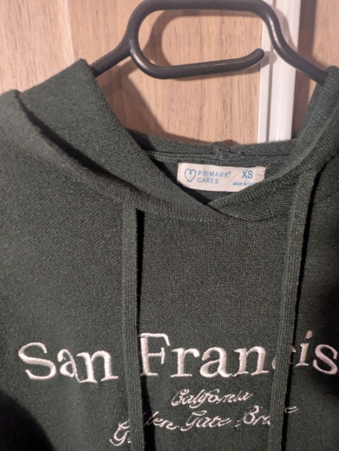 Très peu porté, sweat à capuche de couleur vert sapin avec écritures au milieu de couleur blanc, marque Primark