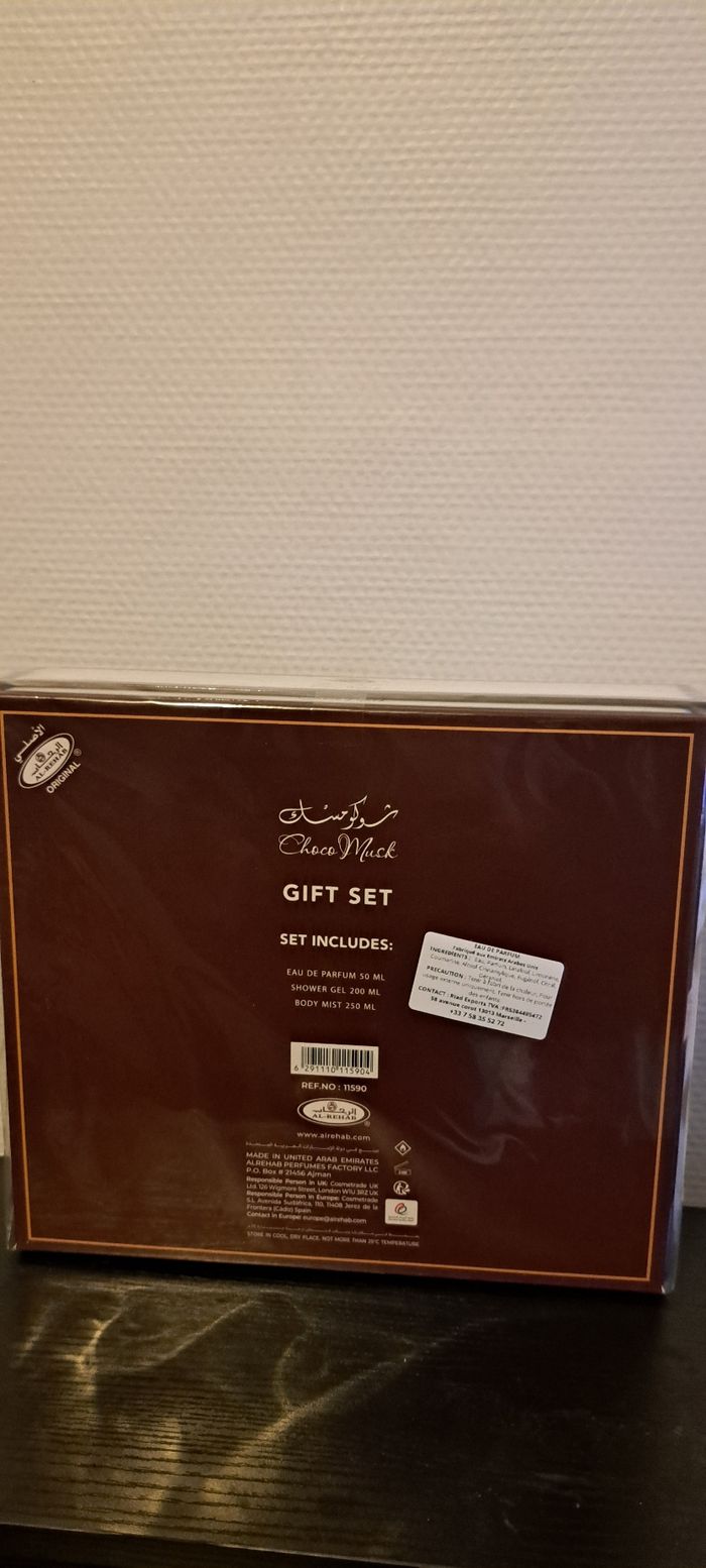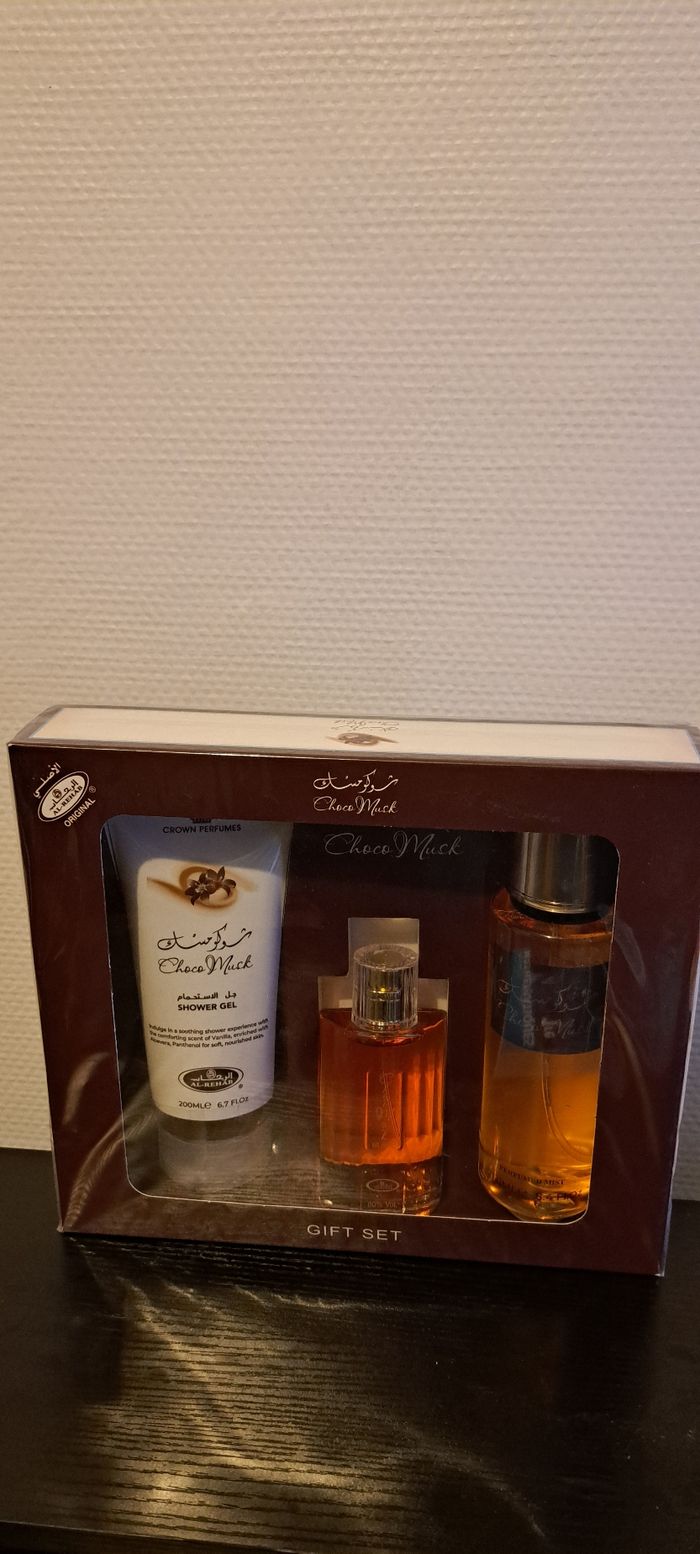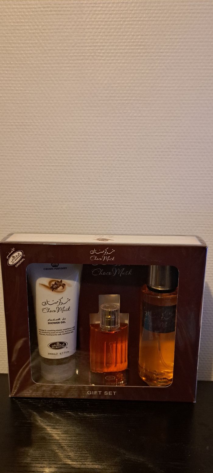 Coffret choco musk a offrir comme cadeau composé de : -Parfum choco Musk 50ml -Brume Choco Musk 250ml -crème choco musk 200ml Neufs et Authentiques de la maison Ayat