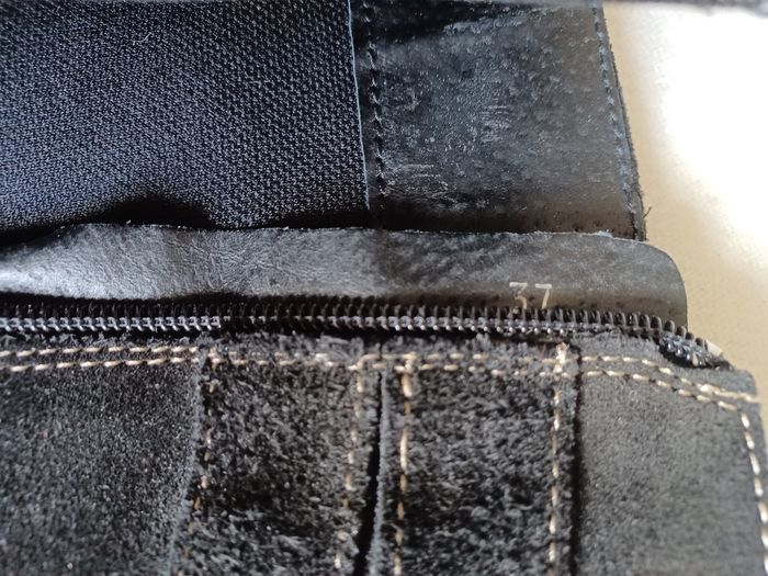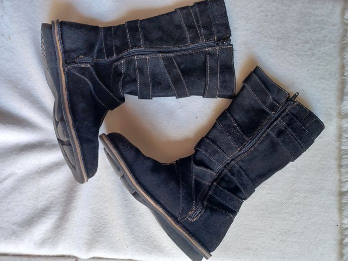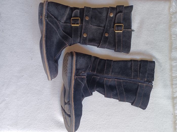 Bottes mi-hautes avec 2 boucles et 4 "rivets" Pointure 37 Largeur mollet 18 cm à plat en haut de la botte Hauteur du talon au haut de la botte 29 cm Confortable semelle assez épaisse Voir étiquette pour le cuir : "dessus et première intérieure cuir".