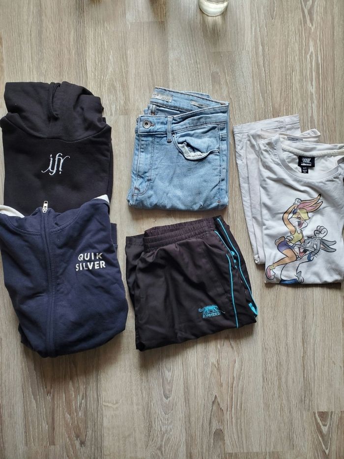 Lot 14 ans : - Veste à capuche zippée marine Quicksilver. Taille 14ans. Parfait état. - Sweat à capuche noir Ify. Taille M. Parfait état hormis cordon qui est un peu cassé sur le bout. - 2 t shirts blancs motif Looney Tunes. Taille S. Bon état général mais un peu jauni au niveau des aisselles et du col. - Short sport Airness. Taille S. Parfait état. - Jean skinny bleu clair Mango. Taille S. Parfait état, hormis petit trou en haut de la cuisse.