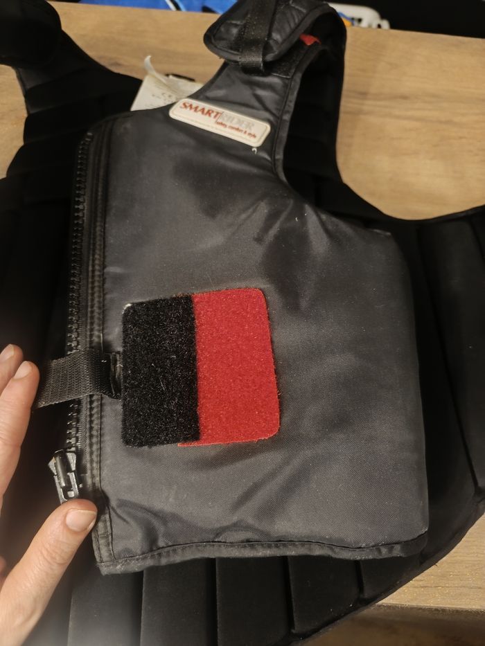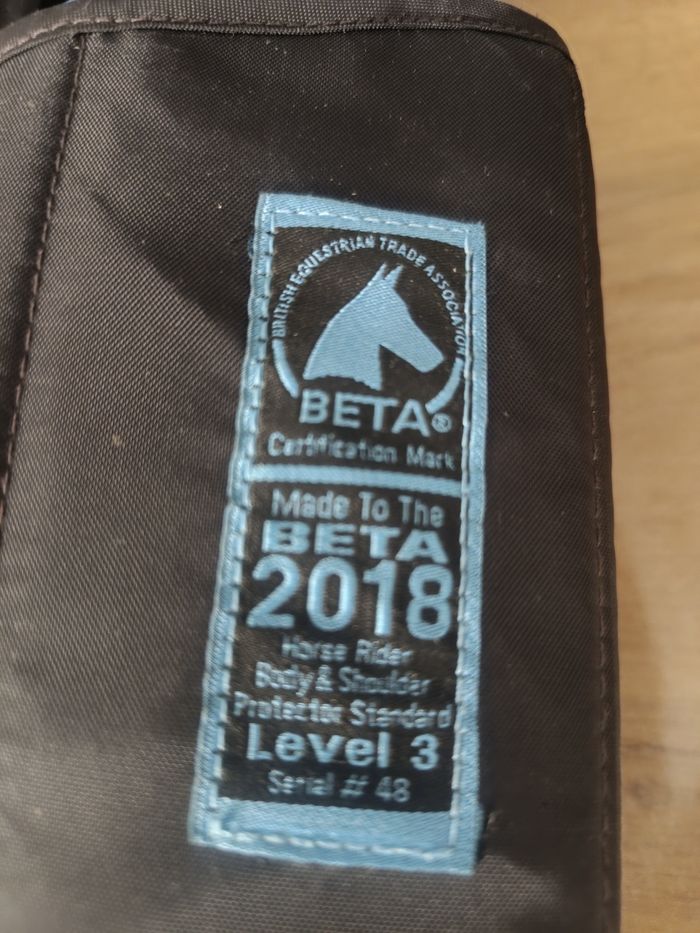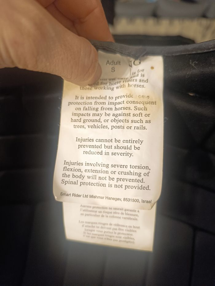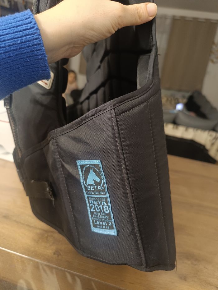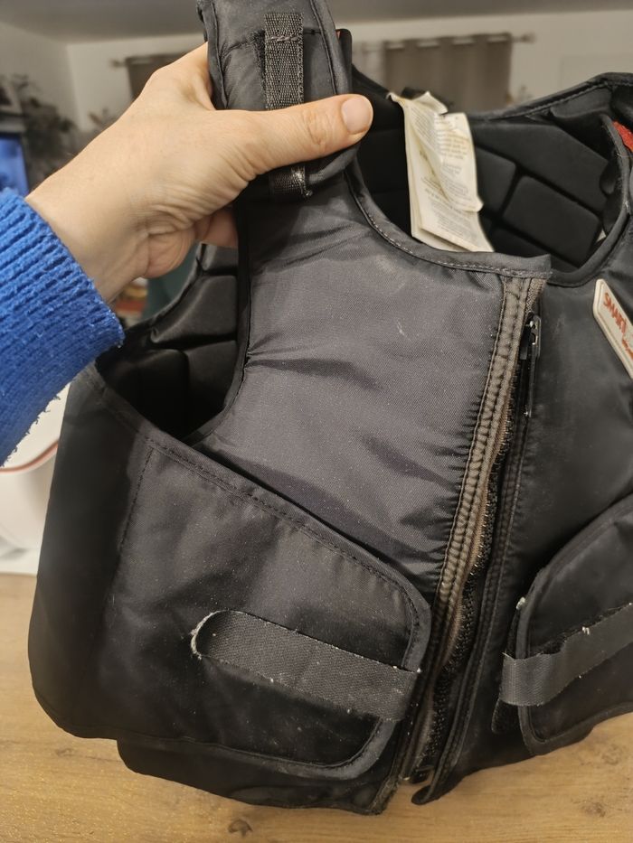 Protection dorsale équitation taille S en parfait état, ma fille n'est jamais tomber avec. Il est confortable et pratique. Facile a nettoyer, tout les scratchs se retire pour faciliter le nettoyage.
