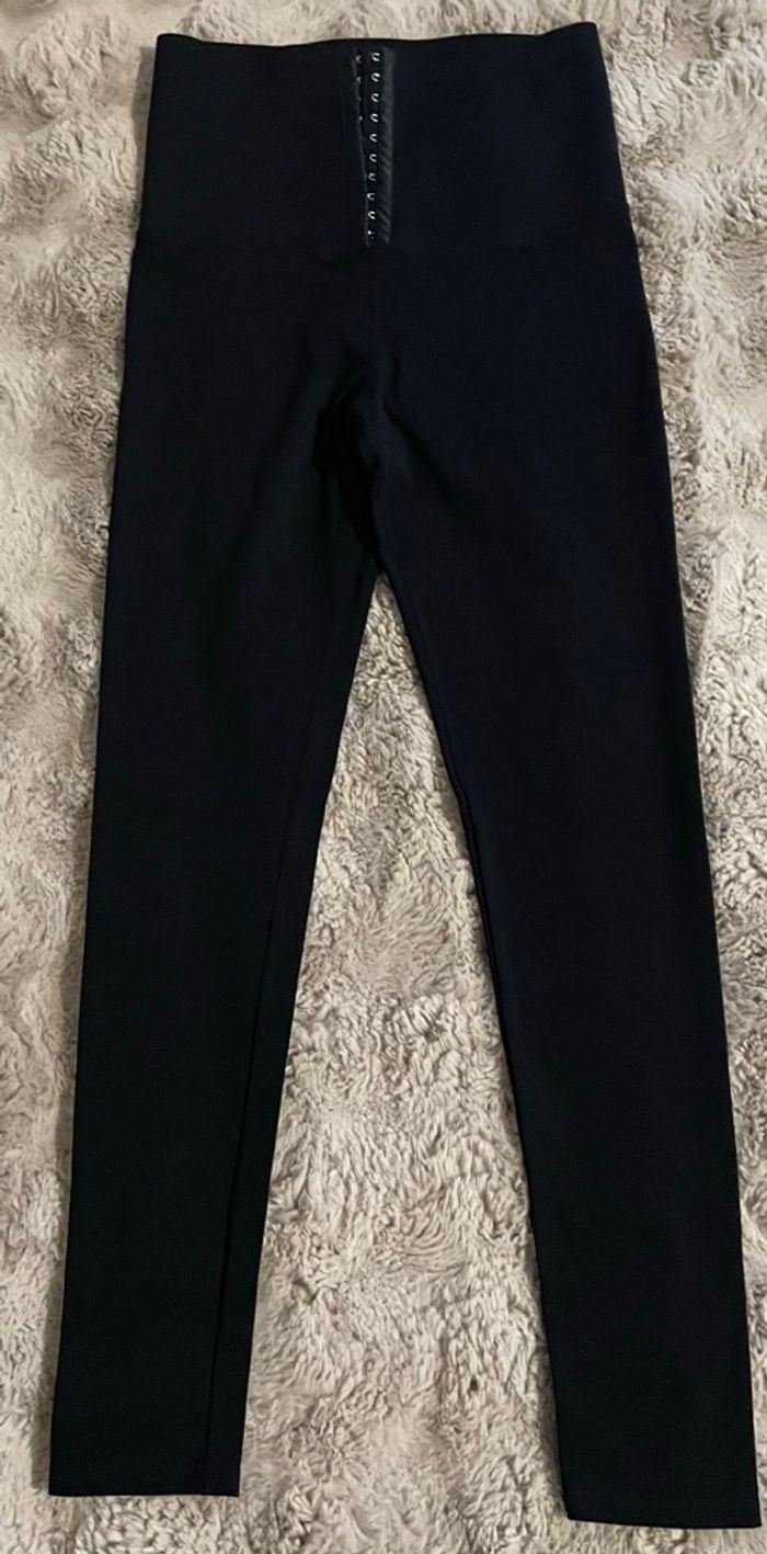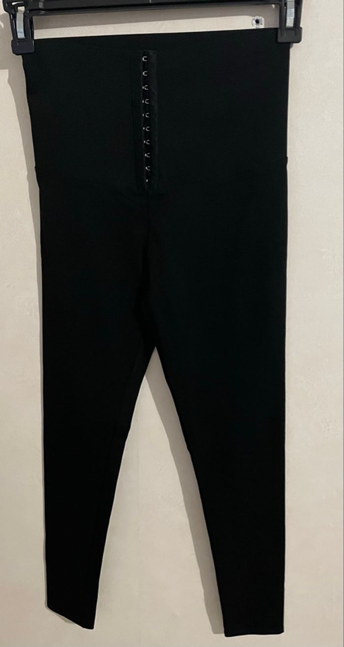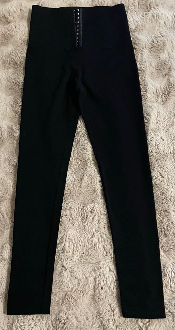 Legging gainant noir, taille haute, avec fermeture frontale à agrafes pour un maintien optimal et un effet ventre plat. Taille 38/40 Matière extensible et confortable, idéale pour affiner la silhouette. Peut être porté pour le quotidien, le sport ou sous des vêtements Matière : 75 % polyamide, 25 % élasthanne porté très bon état Dimensions à plat longueur 95 cm Entre jambes 68 cm